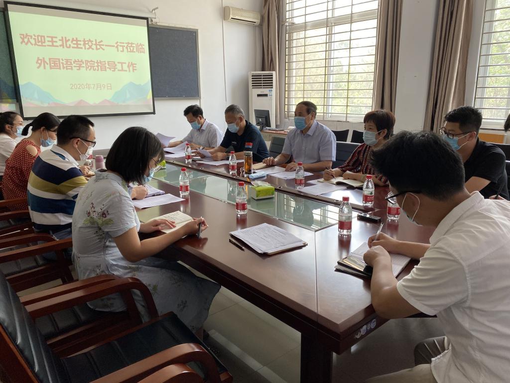 7月9日下午,校长王北生,副校长王强,人事处处长张凌江,教务处处长陈文涛等一行来到外国语学院调研指导教学评建工作。外国语学院院长罗德喜、党总支书记李静及全体领导班子成员参加了座谈。