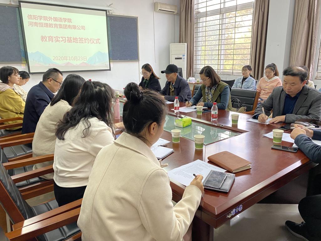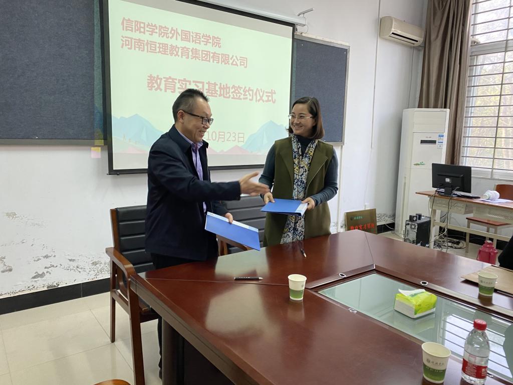 10月23日下午,信阳学院外国语学院与河南恒理教育集团在外语楼110会议室举行签约仪式。河南恒理教育集团总经理张勇、河南恒理教育集团副总经理王继胜、郑州轻工业学校常务副校长高登林、河南恒理教育集团行政人事主任刘晨丽,外国语学院院长罗德喜、教学副院长兼党总支书记李静和师生代表共同参加了活动。院长罗德喜主持了签约仪式。