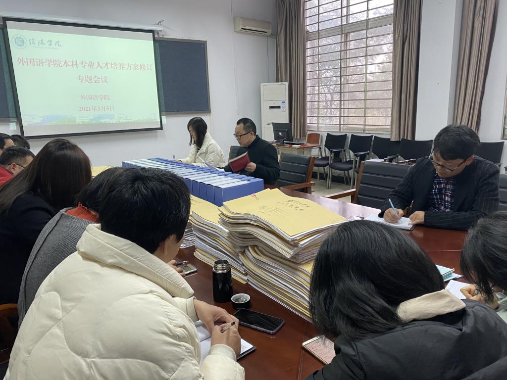 罗德喜传达了信阳学院2020版本科专业人才培养方案评审会议精神,结合我院专业实际情况,对下一阶段人才培养方案的修订作出了具体安排。与会成员共同探讨了各个专业的人才培养方案,对人才培养的修订工作进一步细化。明确了各专业学分、学时的调整范围,敲定了外国语学院英语专业、商务英语专业、翻译专业的专业培养方案。提出了制定科学、合理的人才培养目标的要求,为建设一流本科教育、全面提高人才培养质量而努力。