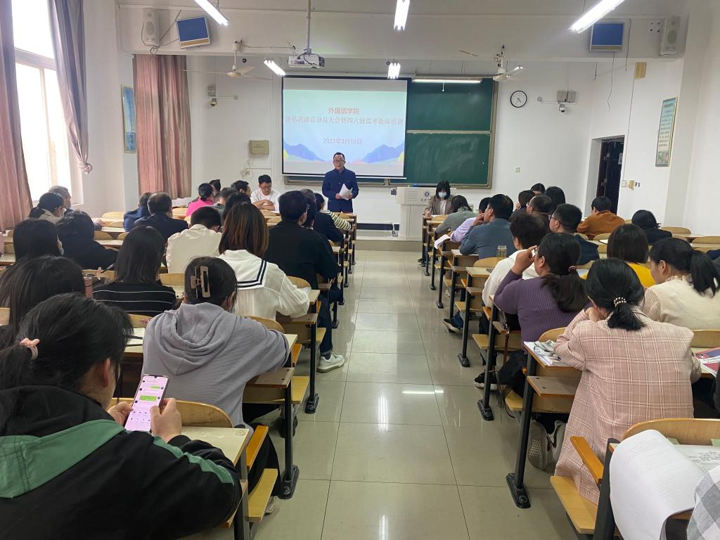 3日10日下午,外国语学院在302教室召开一流本科专业建设暨评估决战总动员大会。外国语学院院长罗德喜、党总支副书记程娇炎、教学副院长李静、学院干事、教务员和全体教师参加本次会议。会议由李静主持。