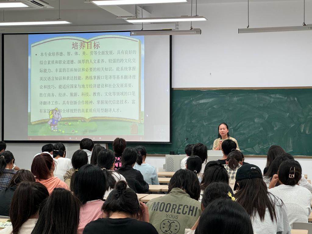 9月27日晚上,外国语学院在南湖校区教二楼211教室对2024级翻译本科专业115名新生开展了专业教育。翻译教研室主任梁法丽和教师代表张孟杰主讲。