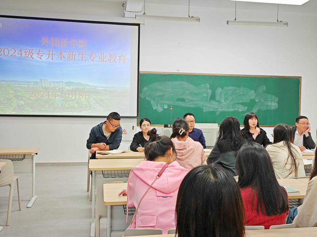 10月8日下午,外国语学院2024级英语专升本新生专业教育会议在教二楼410举行。外国语学院院长罗德喜、教学副院长李静、语言文学教研室主任周善春、教学干事李达、学工干事何珊珊、专升本班辅导员夏茹茹及2024级专升本全体同学参加了此次会议,会议由李静主持。