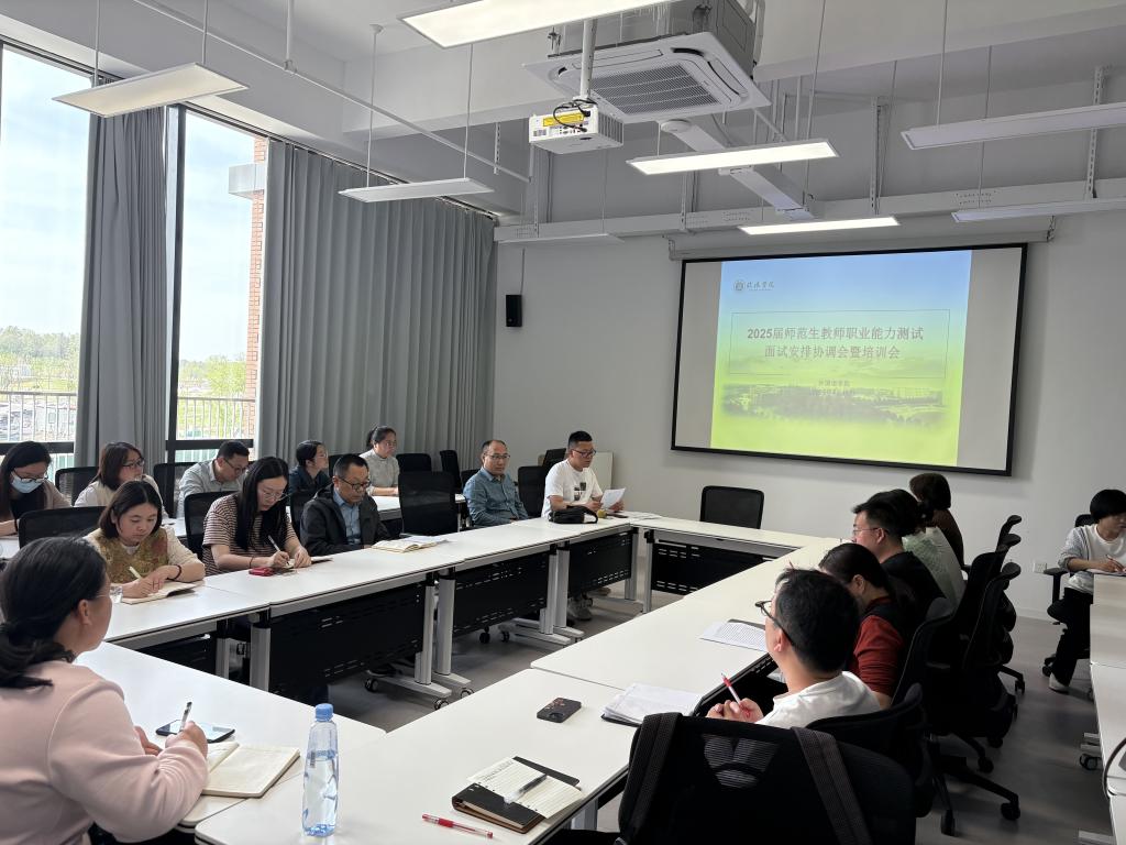 为确保2025届师范生教师职业能力测试面试工作顺利开展,4月15日下午,外国语学院在316会议室召开面试安排协调会暨培训会。院长罗德喜、党总支副书记程娇炎、教学副院长李静出席会议,全体面试评委及相关考务人员参会。会议由教学干事李达主持。
