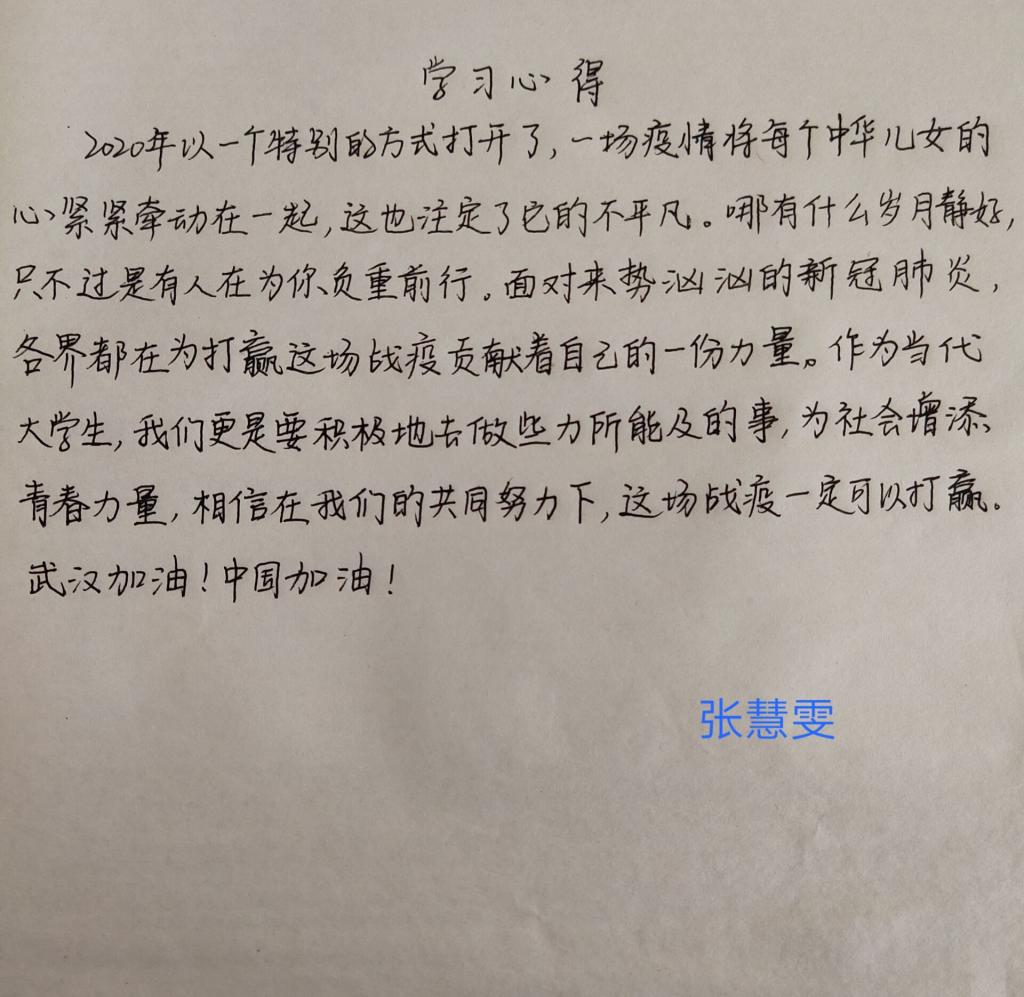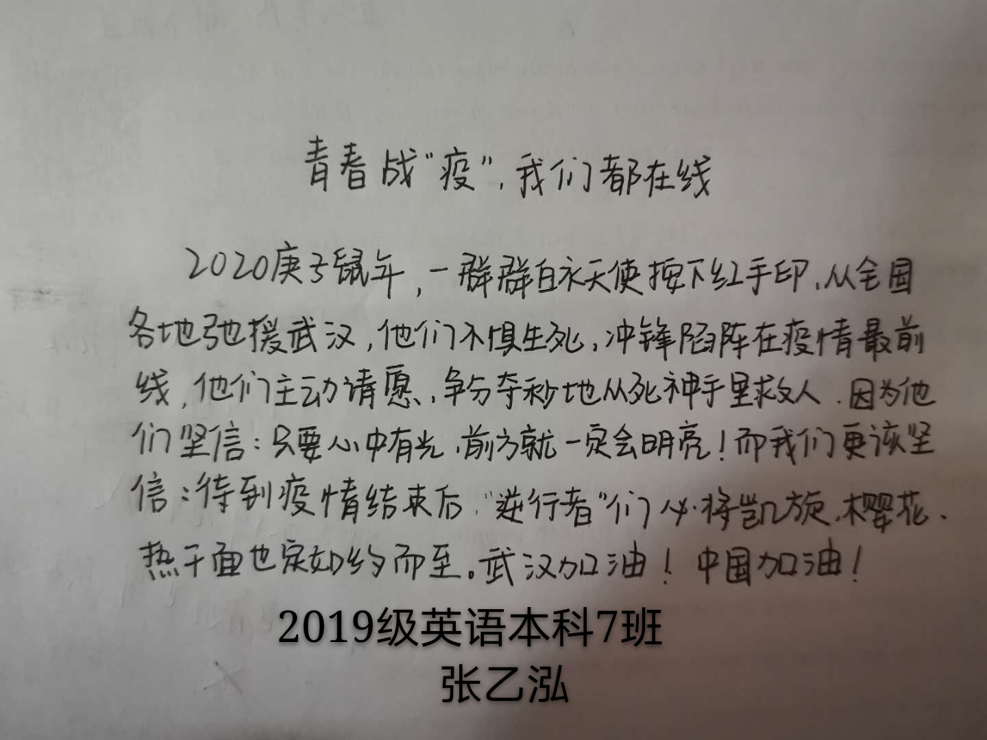 2017级翻译班杨梦娇说:“疫情当前,我深切地感受到了祖国的强大和温暖,全国上下紧密地团结在以习近平同志为核心的党中央周围,携手奋战,一幕幕医护人员感人的场景时刻在脑海回荡,向这些‘最美逆行者’致敬,相信冬天终会过去。”