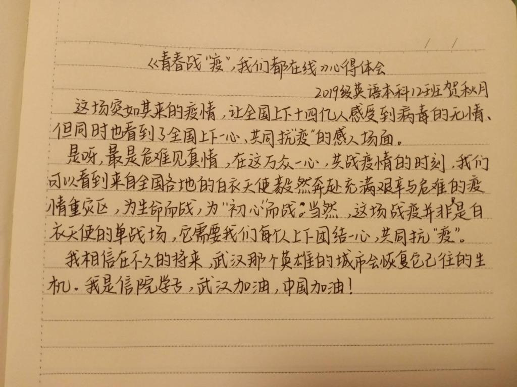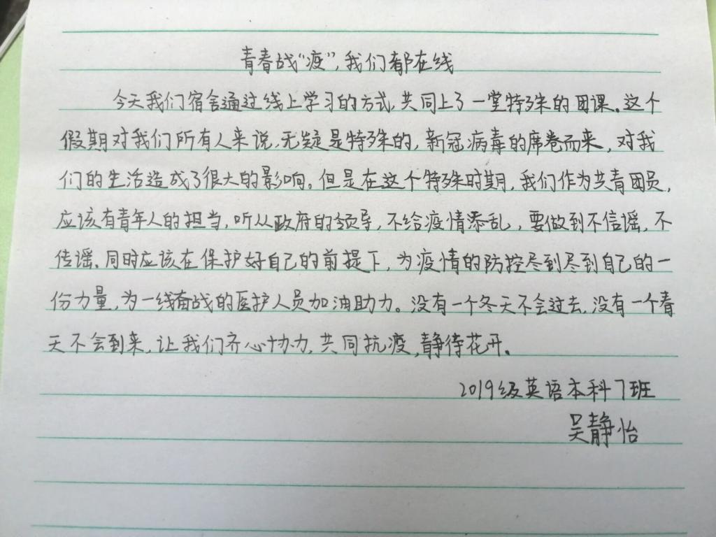 会后,各班级支部在团支书的带领下,通过个人自学、班级线上集中学习交流、分享学习心得等方式将这一堂特殊的团课做到了往心里走、往深里走、往实里走。2018级英语本科10班团支书任文娟在学习中说:“在疫情当前,作为新时代的团员青年,我们要与祖国‘同呼吸、共命运’,自觉地肩负起青年的使命、义务、责任和担当,在磨难中成长,在疫情中做好自己份内之事,以青年的方式助力战‘疫’的胜利。”