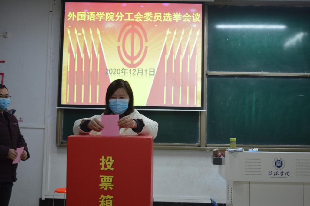12月1日下午,外国语学院在外语楼202教室召开外国语学院分工会委员补选会议及分工会主席选举会议,全体工会会员参会。会议由分工会委员梁书荣主持。