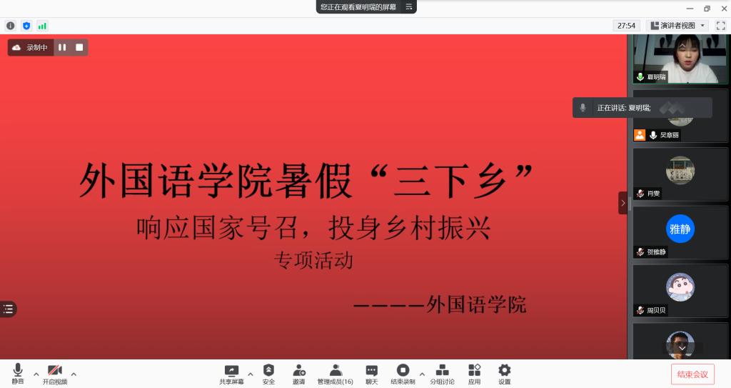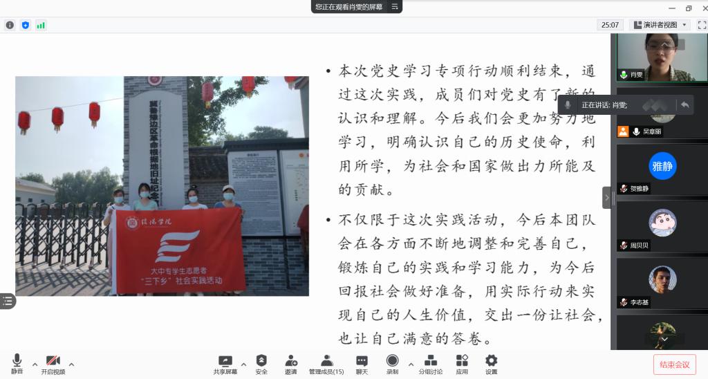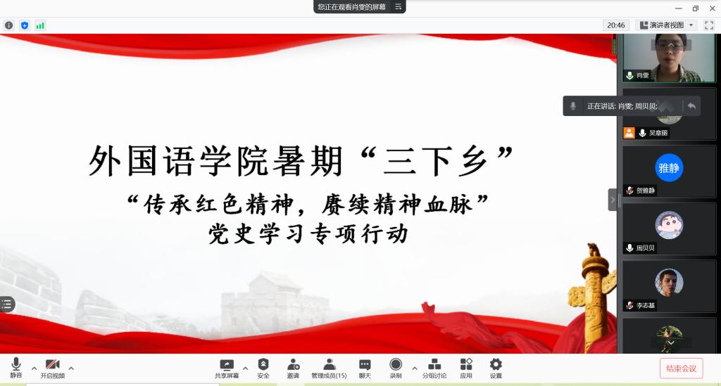 为深入学习贯彻习近平总书记“七一”重要讲话精神,加强党史学习教育,贯彻落实习近平总书记关于青年工作的重要思想,为此,外国语学院结合2021年我校学生志愿者暑期文化科技卫生“三下乡”社会实践工作,于9月18日下午3:30线上组织开展“重温革命历史,勇担时代使命”活动,活动中,同学们主要围绕习近平总书记的讲话内容和近期的“三下乡”社会实践经历进行汇报并发表感想。