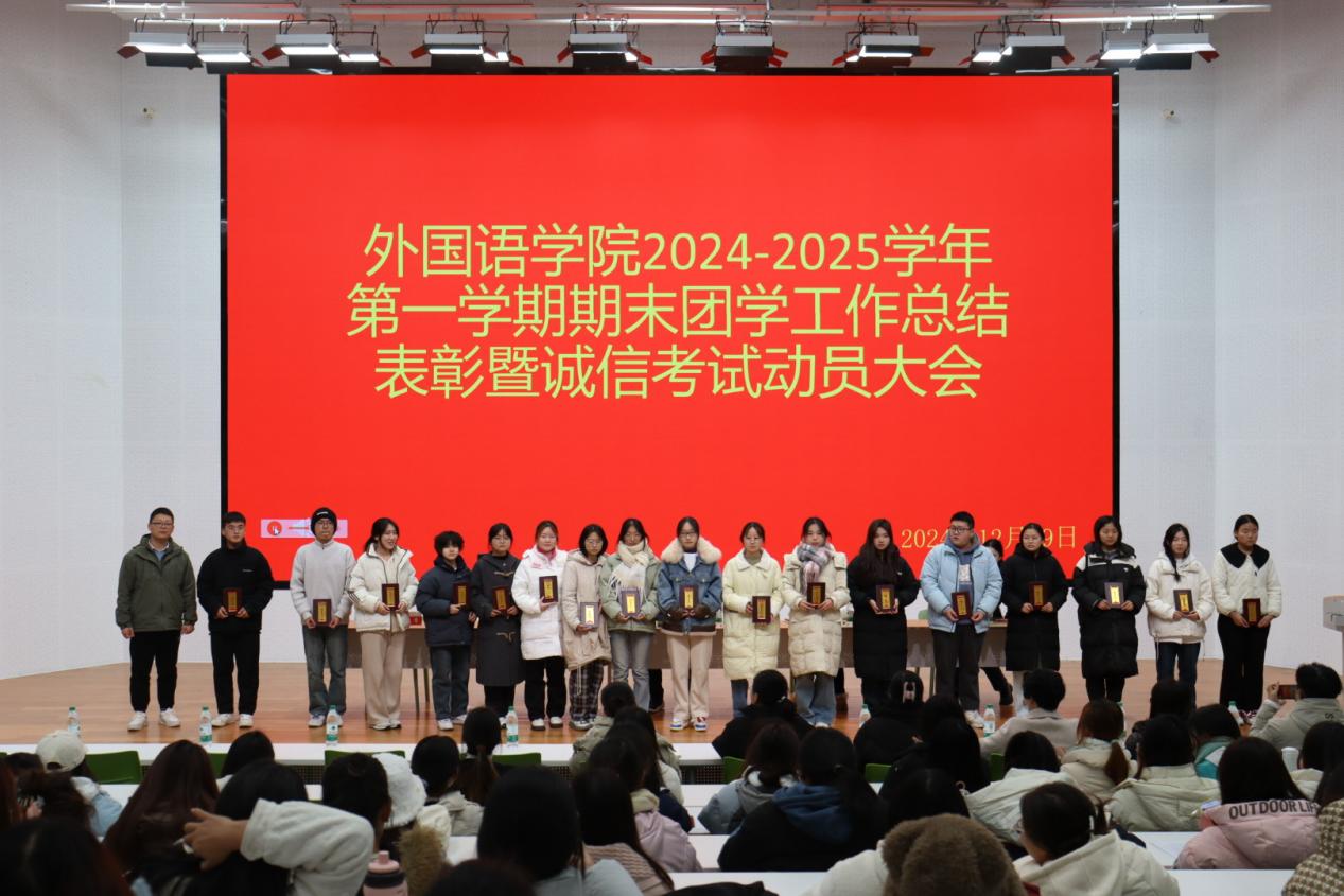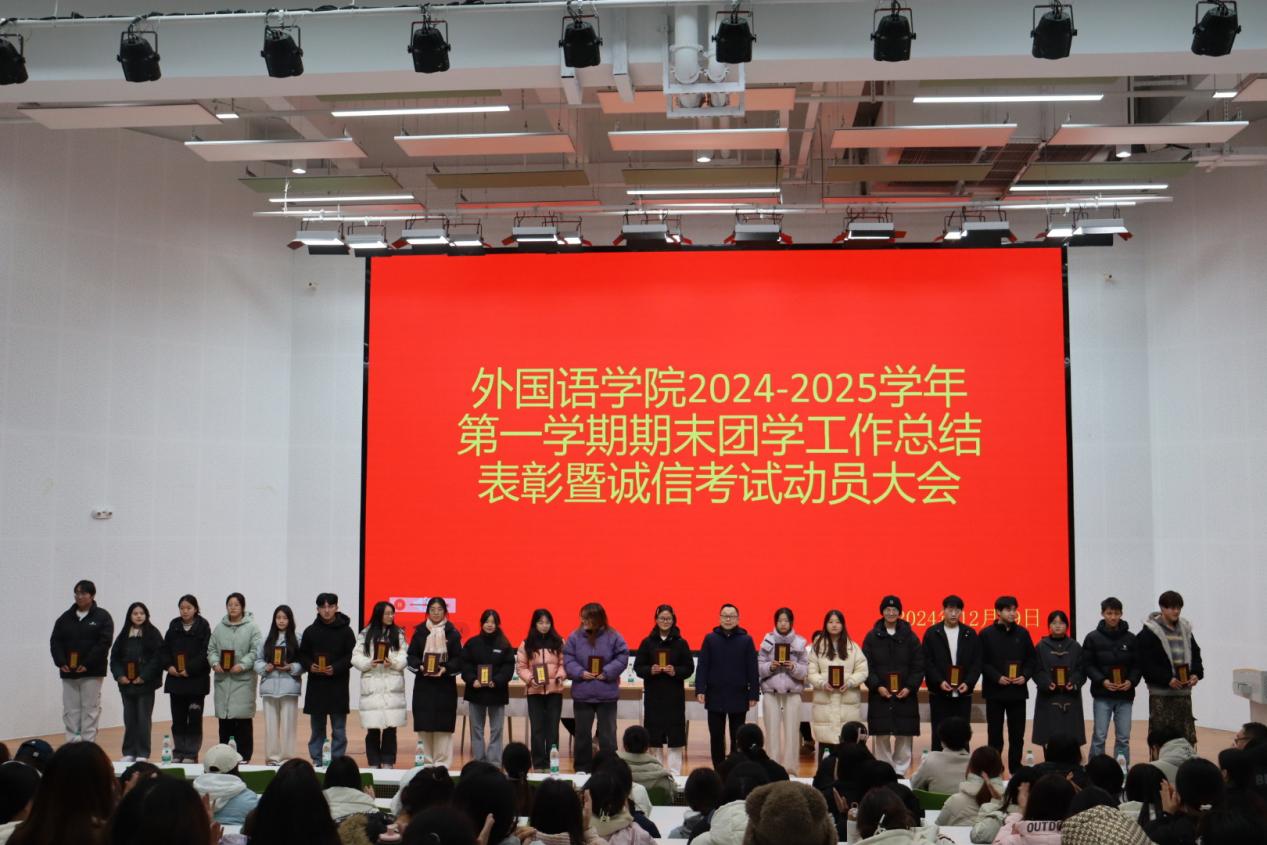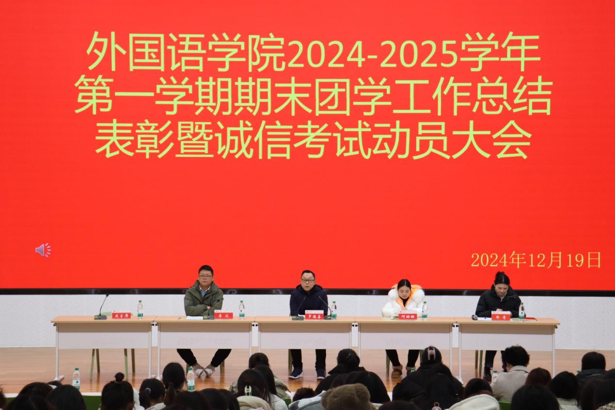 2024 年 12 月 19 日中午,外国语学院 2024-2025 学年第一学期期末团学工作总结表彰暨诚信考试动员大会在教二楼 117 报告厅隆重举行。院长罗德喜、学工干事何珊珊、教学干事李达、团总支书记郑青以及全体辅导员老师、第十八届学生会全体成员和 23 级、24 级班委代表共同参与此次会议,会议由团总支书记郑青主持。