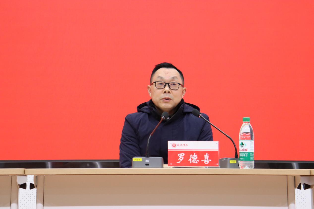 最后,罗德喜院长发表总结讲话。对本学期团学工作取得的显著成效给予了高度肯定,他指出,在过去的这一学期里,无论是丰富多彩的校园文化活动的成功举办,还是在服务同学、助力学院发展等方面,团总支和学生会都展现出了强大的凝聚力与创造力,每一位成员的辛勤付出都为学院增添了活力与光彩。他对全体师生表示诚挚的感谢,感谢大家在各自岗位上的坚守与奉献。同时,院长鼓励同学们在未来的学习与工作中要以更高的标准要求自己,不断挖掘自身潜力,积极拓宽视野,提升综合素质。他强调,团学组织应继续发挥桥梁纽带作用,紧密围绕学院中心工作,为同学们提供更多成长成才的机会与平台。接着院长再次着重强调诚信为本的理念,他表示诚信是立身之本,是学术研究和个人发展的基石。希望同学们能深刻领悟诚信的内涵,将诚信意识融入每一次考试、每一项学习任务以及日常生活的点点滴滴中。做一个品德高尚、值得信赖的新时代青年,为学院的优良学风建设添砖加瓦,为个人的长远发展奠定坚实基础。
