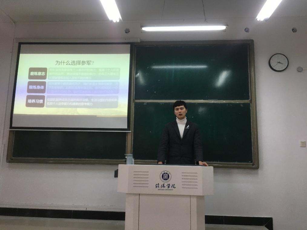 同时邀请外国语学院往届优秀毕业生暨退役大学生龙东政为现场同学讲述自己在部队里的丰富经历和心路历程,为大家树立了优秀的学习榜样,更加让同学们感受到当兵的光荣。