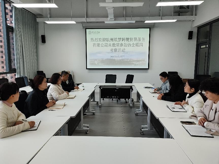 刘涛向大家介绍了杭州政府人才引进政策、杭州筑梦跨境贸易服务有限公司的发展和招聘需求。此次访企拓岗活动为外国语学院与杭州筑梦跨境贸易服务有限公司搭建了良好的沟通平台,为双方在人才培养、实习就业、产学研合作等方面的深入合作奠定了坚实基础。