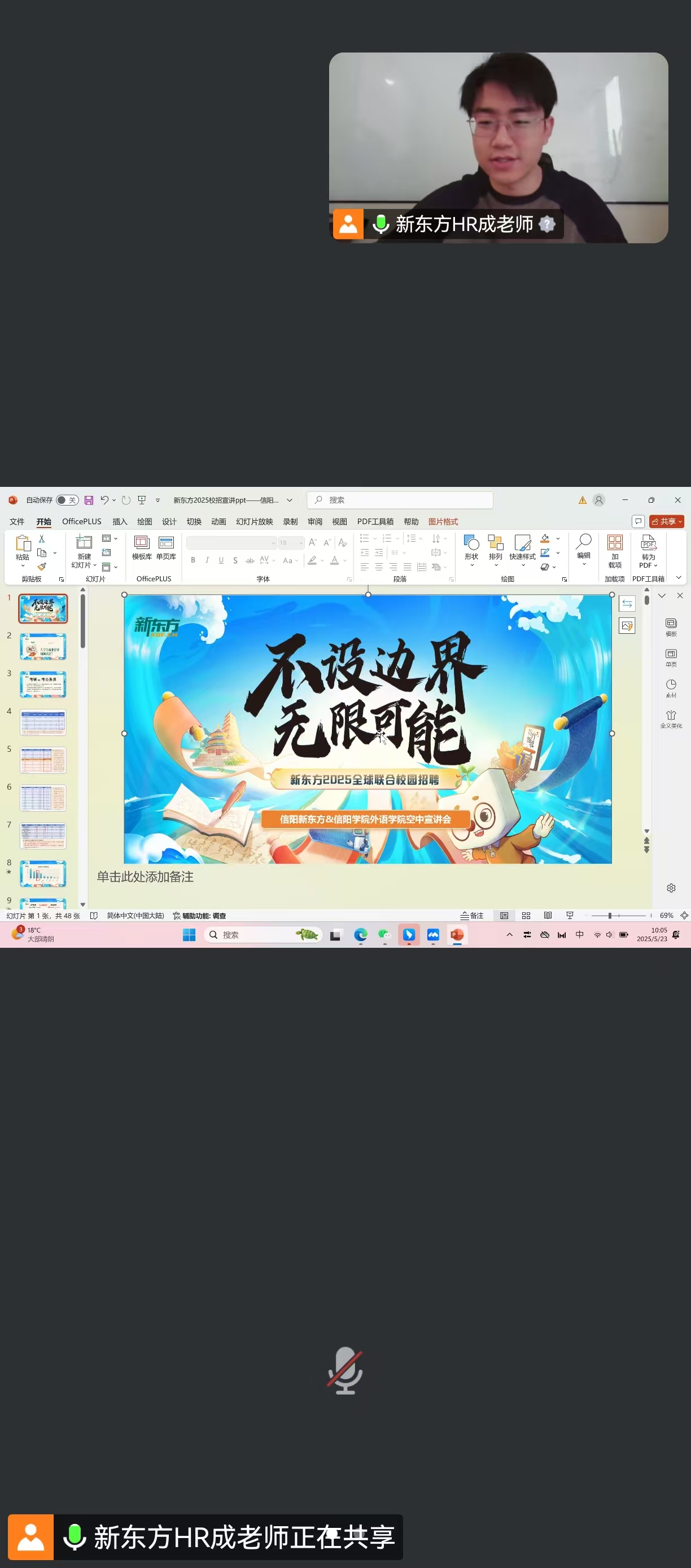招聘会伊始,郑州新东方培训学校有限公司信阳校区的招聘负责人成昕宇通过直播形式,向参与招聘会的同学们播放了精心制作的企业宣传视频,生动展示了校区的教学环境、团队风采和发展成果。随后,负责人借助PPT 进行详细讲解,从公司的发展历程、品牌理念,到信阳校区的业务布局、岗位需求,再到薪资福利体系、员工成长路径等方面,全方位地向同学们介绍企业情况,并着重强调希望吸纳具备扎实语言功底、富有教育热情和创新思维的外国语学院学子加入团队。