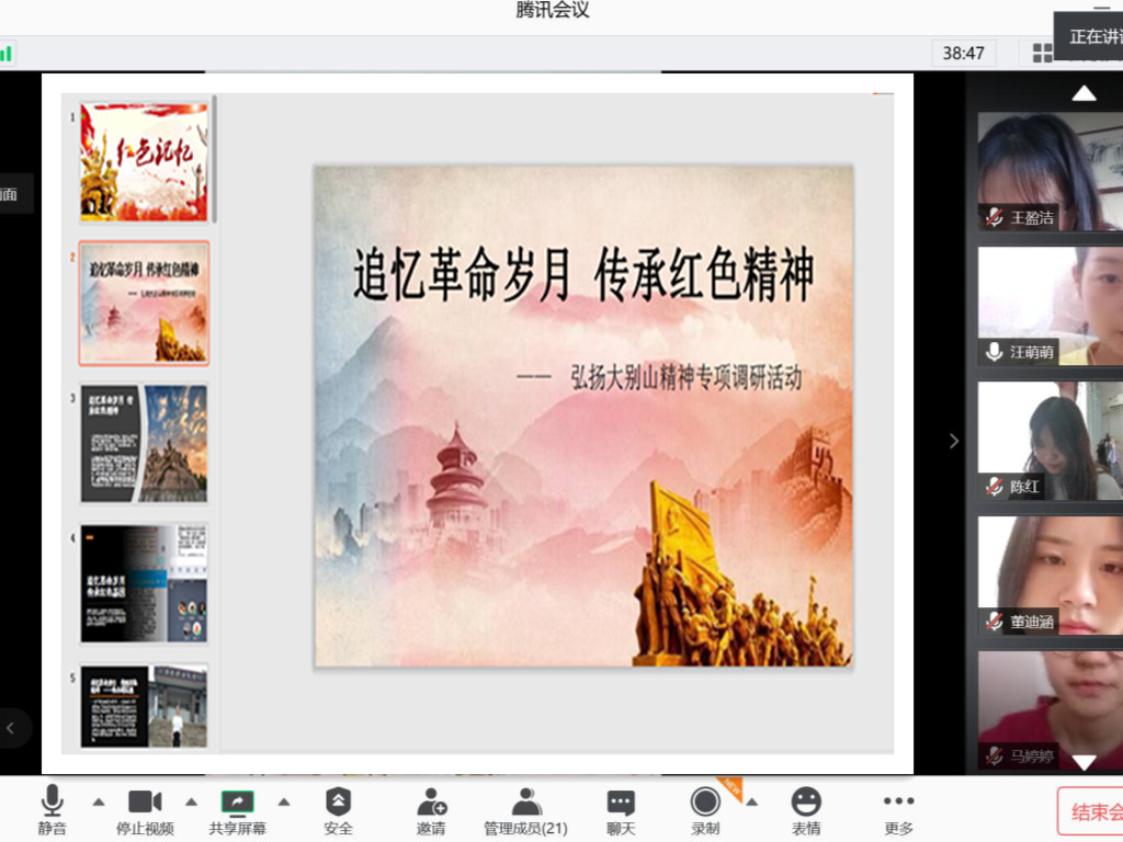 “追忆革命岁月,传承红色精神”专项调研团小组成员说到,弘扬大别山精神宣传调研专项活动是现如今时代红色精神的凝炼,红色文化具有历史印证和政治教育的价值功能,此次活动让我们更加深刻地理解了大别山精神,深深感受到信念的力量,对大别山28年红旗不倒,四度辉煌的革命历史肃然起敬。曾经的艰苦奋斗是为了今天的幸福美好,历史不仅是一本生动的教科书,更是一面映照现实的明镜。我们不仅要重温党的历史,感受党的革命的历史和曲折,学习前辈坚定信念和坚持真理,更要用实际行动来弘扬革命先辈用鲜血凝结的红色文化。在今后的发展中,让大别山精神在新时代永放光芒,就需要我们用好红色资源、发扬红色传统、传承红色基因,真正让大别山精神融入到人民的血脉之中、灵魂深处。