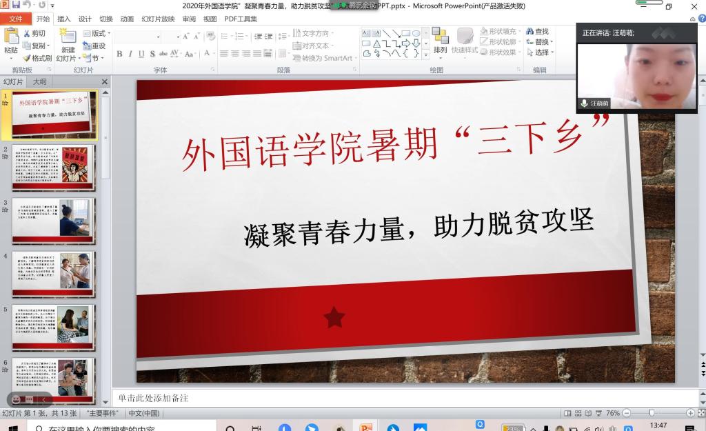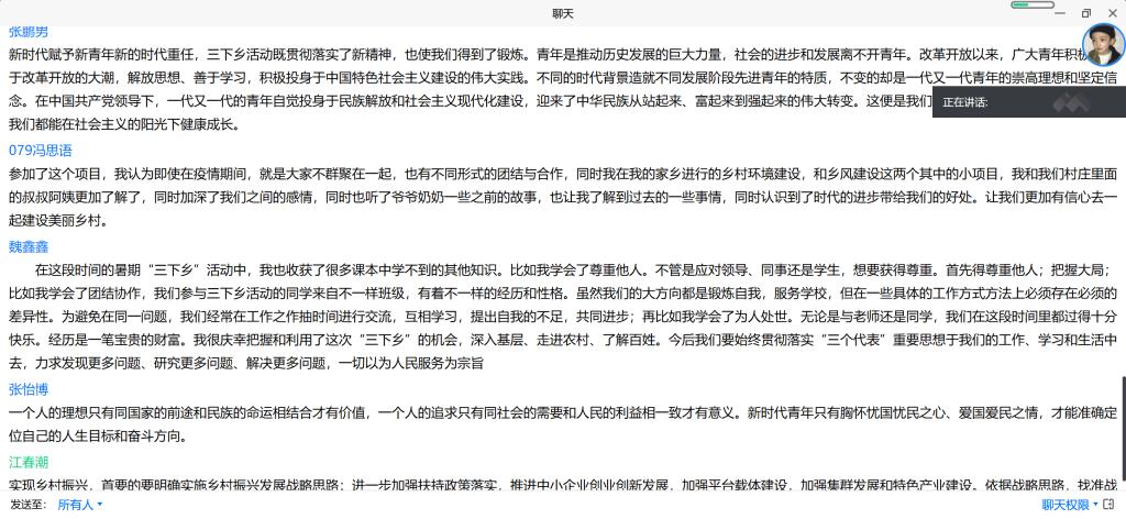 为深入学习贯彻习近平新时代中国特色社会主义思想,切实将思想政治引领元素融入团的各类工作形态中,形成全方位育人的良好局面,结合2020年我校学生志愿者暑期文化科技卫生“三下乡”社会实践工作,外国语学院积极开展“小我融入大我,青春献给祖国”线上主题团日活动,活动中学生围绕学习内容和近期的三下乡社会实践活动谈及自身感悟。
