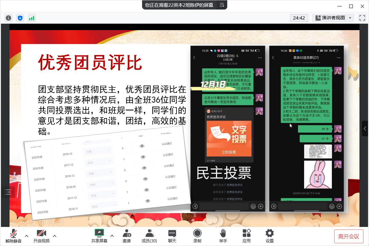 本次述职演讲报告主要由外国语学院2022级各团支部书记汇报工作,汇报以PPT、视频等多种形式从团支部基本情况介绍、团支部所开展的各项活动及团支部学期工作总结与展望等方面进行汇报。每位团支书分别对第一学期所做的工作进行反思总结,并表示今后将继续对团务工作保持着高度的工作热情与强烈的责任感,引导支部同学学习新时代新思想,展现出各班青年团员积极向上、踔厉奋发的精神面貌,彰显外国语学院各团支部的良好风貌。