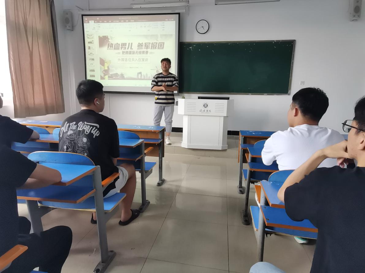 为积极响应党和政府的征兵号召,引导学生将个人理想抱负融入强军梦、中国梦,踊跃报名应征,外国语学院于5月21日下午4点在外语楼308举行征兵入伍宣讲会,外国语学院党总支副书记程娇炎、学工干事何珊珊以及2020级毕业生辅导员参会。