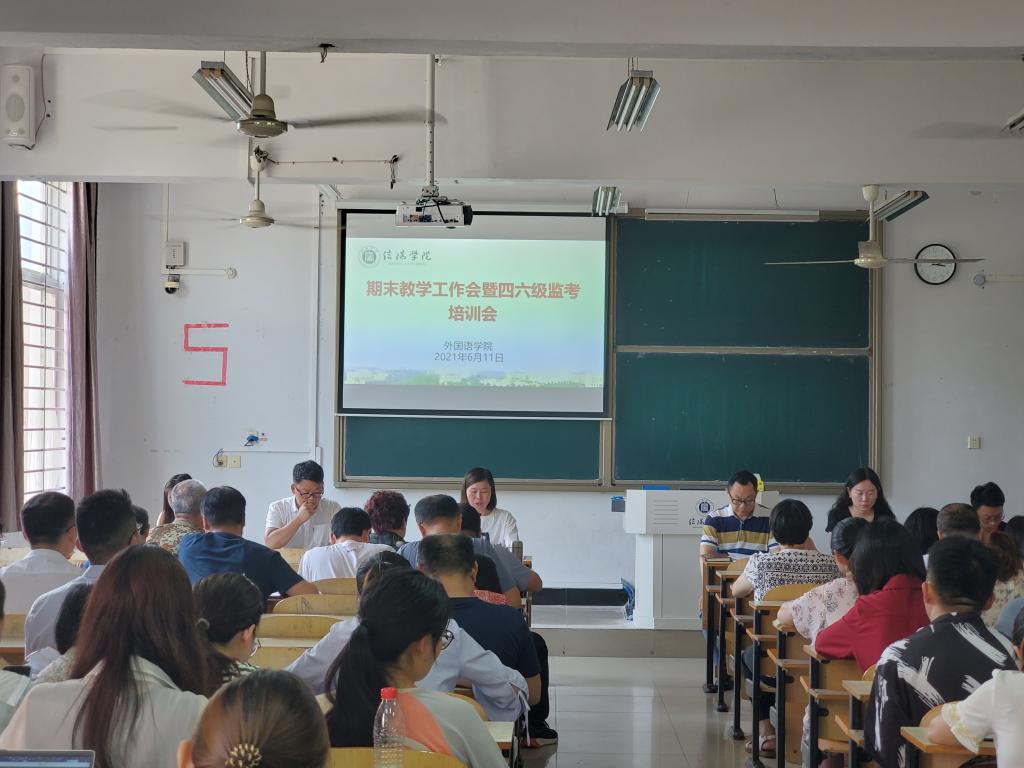 为确保期末考试和四六级考试的顺利进行,6月11日下午,外国语学院在外语楼202教室召开了期末教学工作会暨四、六级监考培训会。外国语学院院长罗德喜、党总支副书记程娇炎、教学副院长李静、行政班子人员及全体教师参加了会议。会议由李静主持。