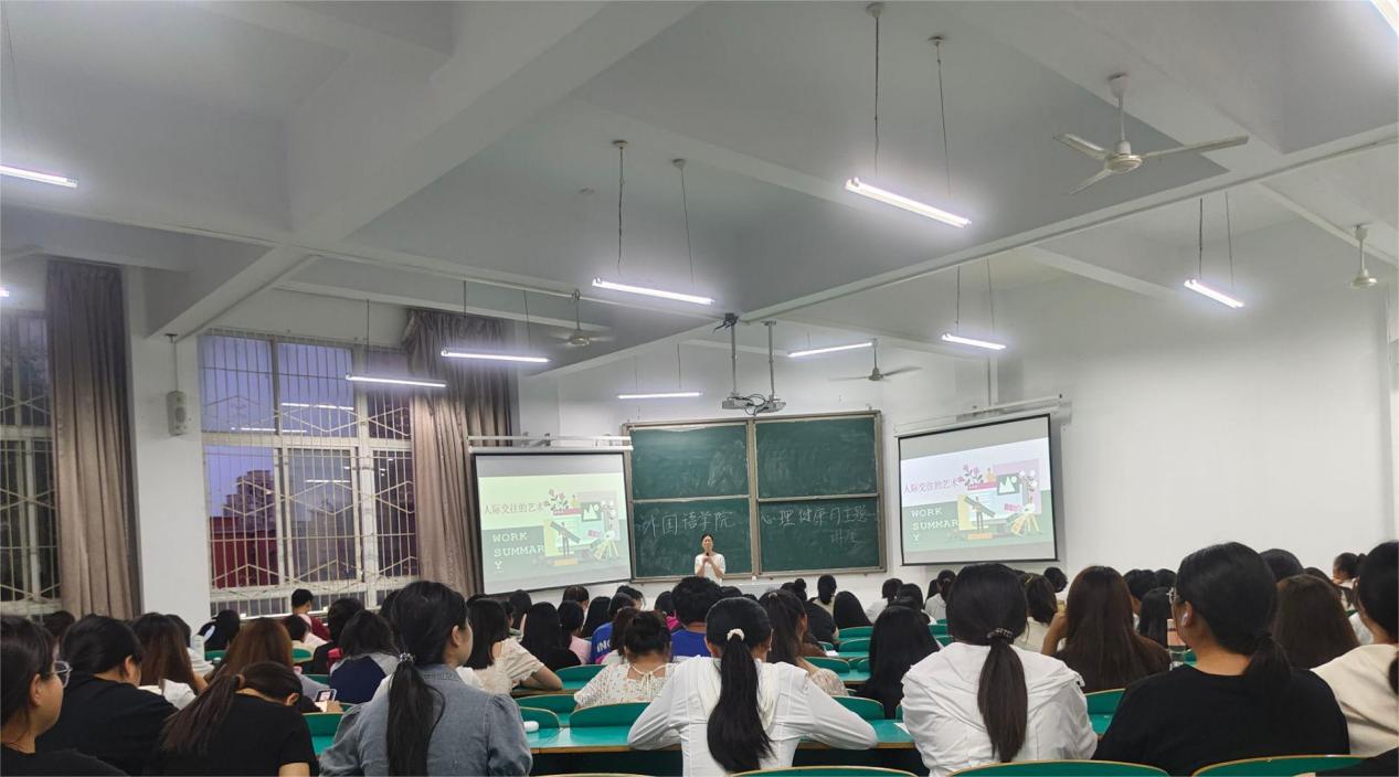 为帮助大学生解决人际交往方面的烦恼,外国语学院于5月21日晚上7:30在数计楼206开展了心理健康月专题讲座--人际交往的艺术。此次心理讲座由外国语学院心理顾问崔小蕊老师主讲,2023级各班心理委员、班长和外国语学院心理健康部成员参加了本次讲座。