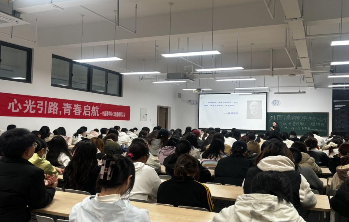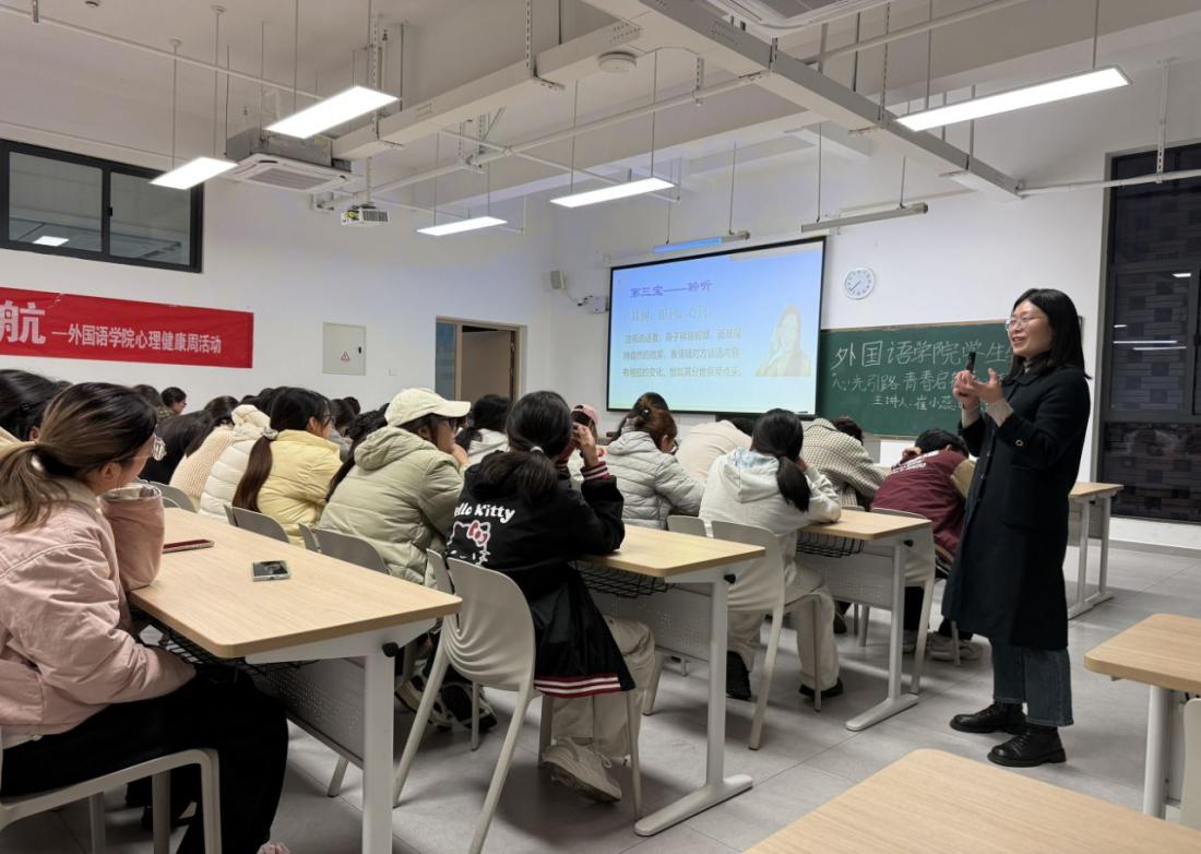 为切实加强大学生心理健康教育工作,帮助学生缓解学业压力、适应校园生活、塑造健康人格,10月24日外国语学院在教二楼415成功举办“心光引路 青春启航”大学生心理健康知识讲座。本次讲座特邀我校心理学专业教师崔小蕊副教授主讲,全院学生代表140余人到场聆听。