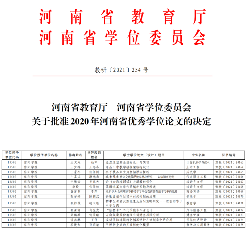 近日,河南省学位委员会、河南省教育厅发布《关于批准2020年河南省优秀学位论文的决定》(教研〔2021〕254号),我校13篇学士论文获评为2020年河南省优秀学位论文,获奖比例位居同类高校前列。