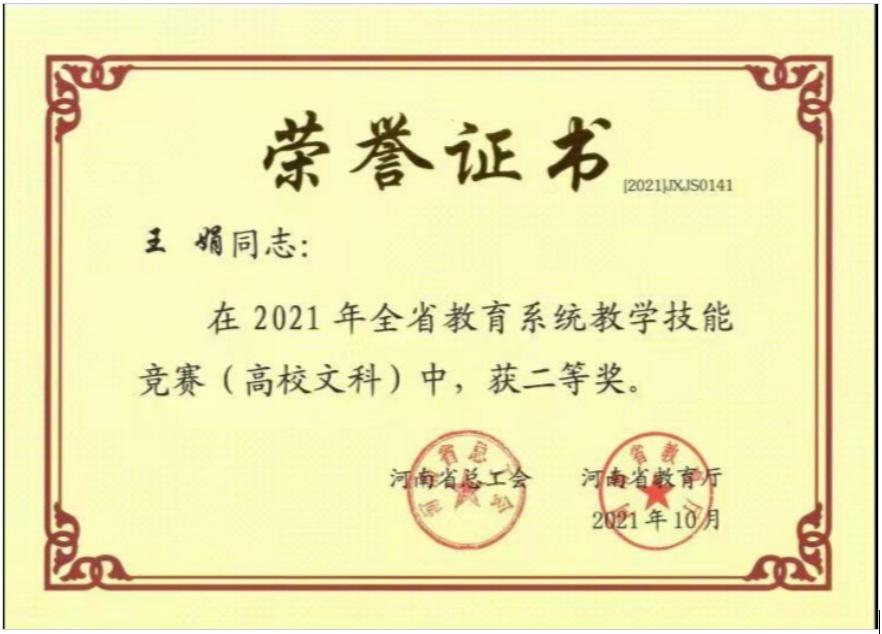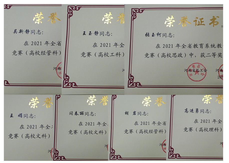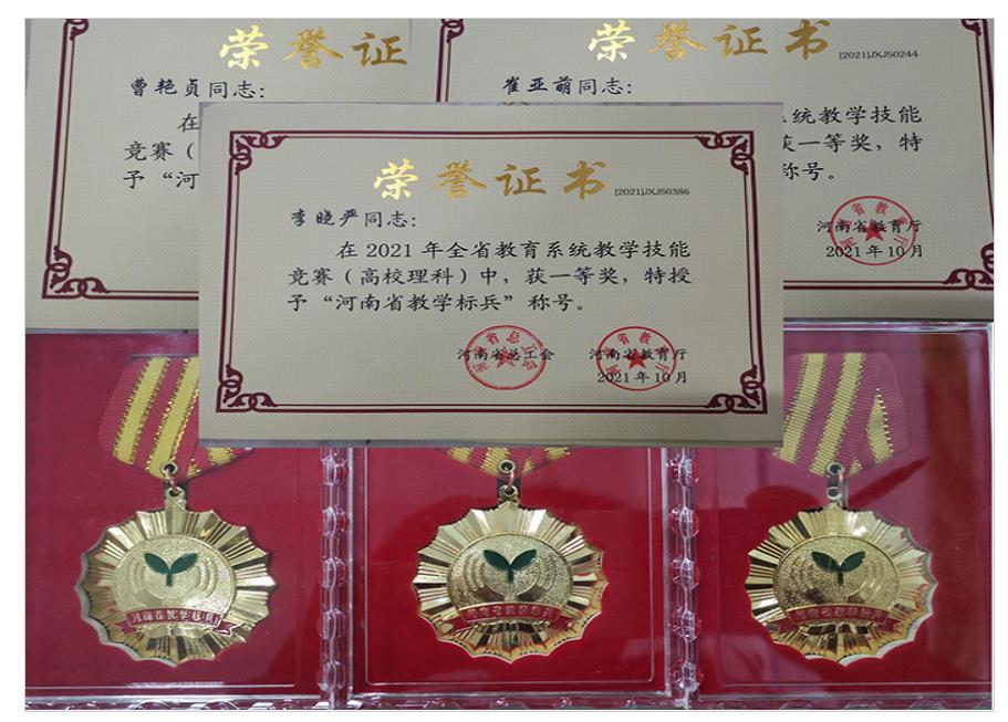 日前,河南省总工会、河南省教育厅发布了《关于表彰2021年全省教学技能竞赛获奖单位和个人的决定》(教工文〔2021〕89号),我校文学院曹艳贞、教育学院崔亚萌、理工学院李晓严三位教师获得一等奖;外国语学院王娟、商学院吴新静、土木工程学院王玉静、马克思主义学院张玉柯获得二等奖;社会科学学院闫春丽、商学院胡岩、理工学院高进勇获得三等奖。曹艳贞、崔亚萌、李晓严同时获得“河南省教学标兵”称号和奖章。