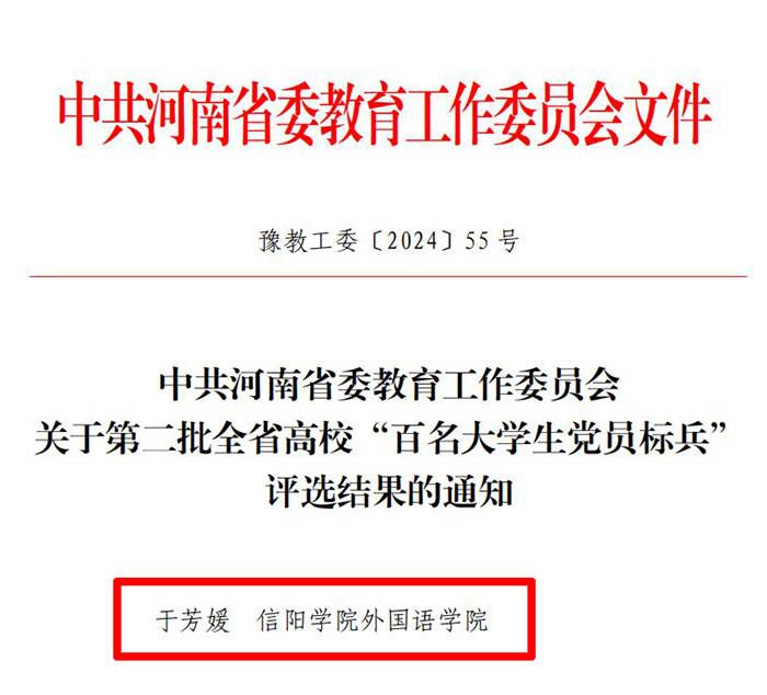 近日,中共河南省委教育工委印发了《关于第二批全省高校“百名大学生党员标兵”评选结果的通知》,经学校选拔推荐,省委教育工委组织专家组评审和网站公示,我校外国语学院2021级学生于芳媛荣获全省高校“百名大学生党员标兵”荣誉称号,系我校学生党员首次获得该项荣誉。