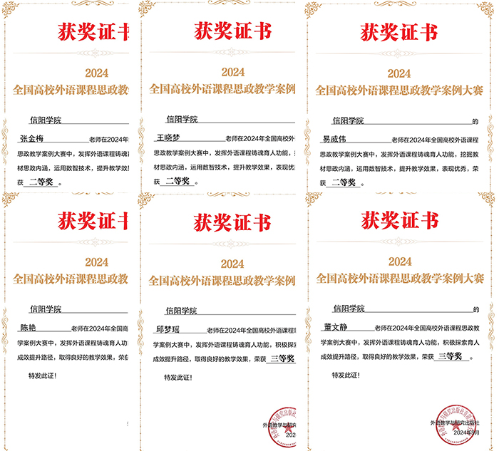 9月10日,外语教学与研究出版社公布了2024年全国高校外语课程思政教学案例大赛获奖名单。我校教师作品在全国各省市自治区各个高校的众多作品中脱颖而出,外国语学院教师王晓梦、易威伟、张金梅荣获二等奖,陈艳、邱梦瑶、董文静荣获三等奖。