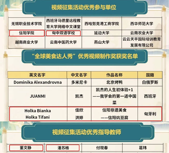 近日,中外语言交流合作中心与中文联盟公布了2024年“全球美食达人秀”视频征集活动的获奖结果。我校外国语学院师生董文静和潘苏格与来自匈牙利匈中双语学校学生佳欣(Holka Bianka)、洪婷(Holka Tifani)联合创作的《信阳非遗美食--信阳炕豆腐》成功入选“全球美食达人秀”优秀作品。