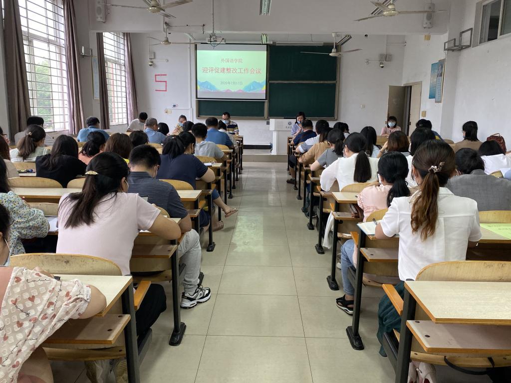 7月17日下午,外国语学院在外语楼202教室召开了迎评促建整改工作会议,外国语学院院长罗德喜,党总支书记李静,教学干事柳衡,学工干事刘阳红,行政干事梁书荣,教务员李达和全体教师参加了本次会议。会议由李静主持。
