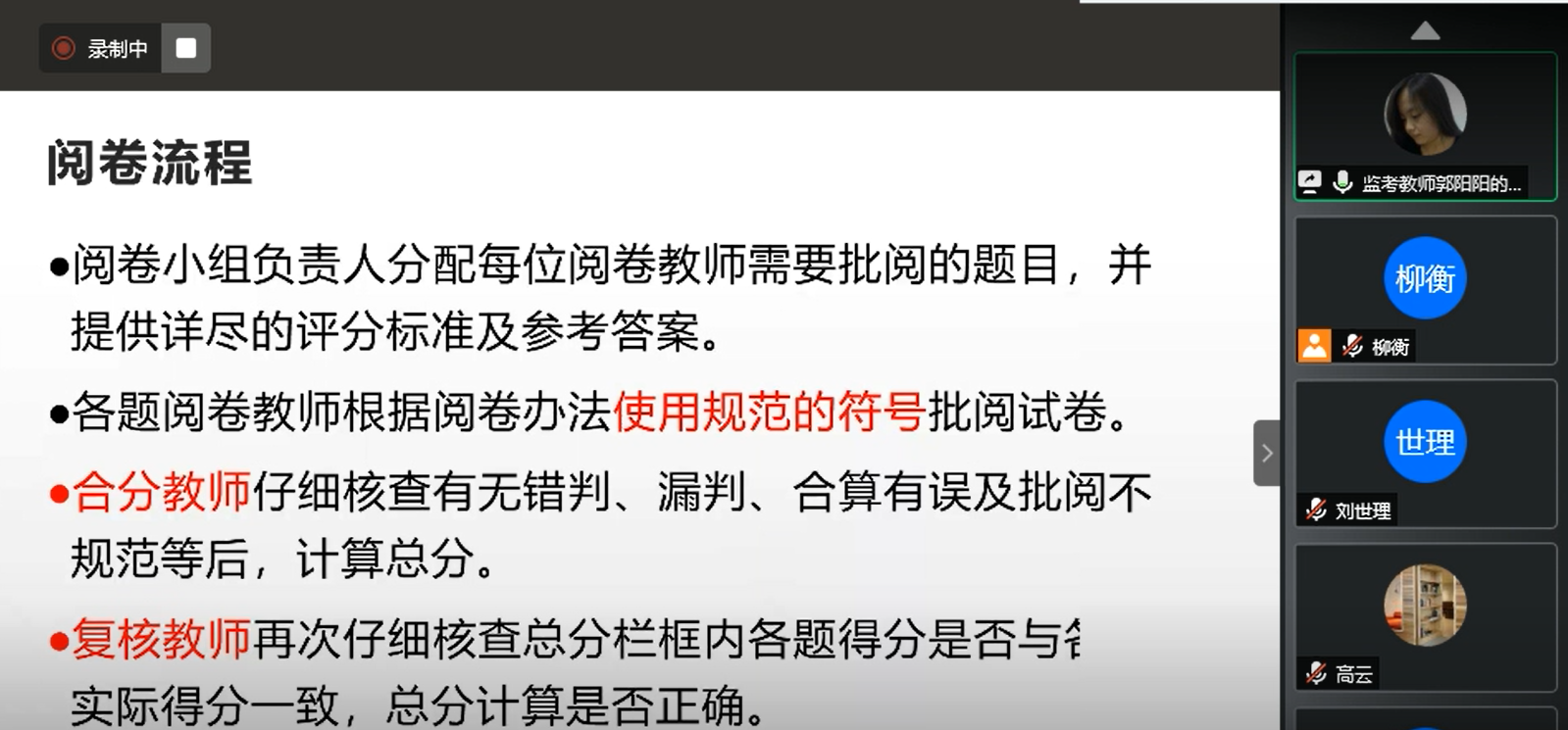 本次期末阅卷培训会由黄仕圆老师、余兰老师、郭阳阳老师、李萍老师及罗颖老师担任主讲人,培训内容包括答题卷装订的封面内容填写、选择题、填空题等各种题型的阅卷方法,强调英语专业课、第二外语专业课、及大学英语公共课的评阅注意事项。培训会期间没有监考任务的老师们均积极参与其中,并根据阅卷过程中的疑问进行了咨询,主讲老师们一一完成了线上答疑。