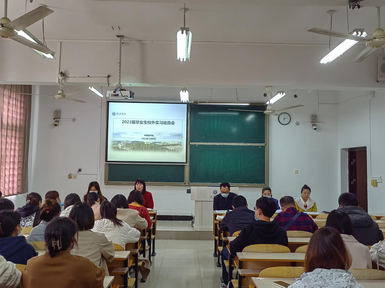 10月9日下午,外国语学院在外语楼202教室召开了2023届毕业生校外实习动员会。参会人员有外国语学院院长罗德喜、教学副院长李静、学工干事何珊珊、教学干事李达、教务员井自纯、实习带队教师、毕业班辅导员和2019级各班班长和学委。本次会议由李静主持。