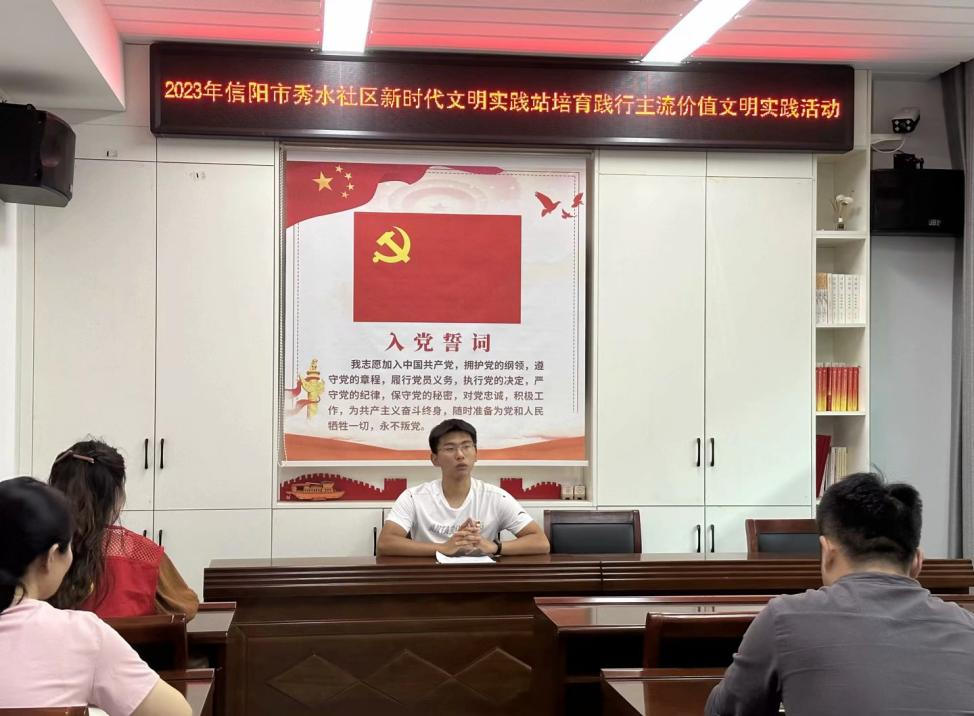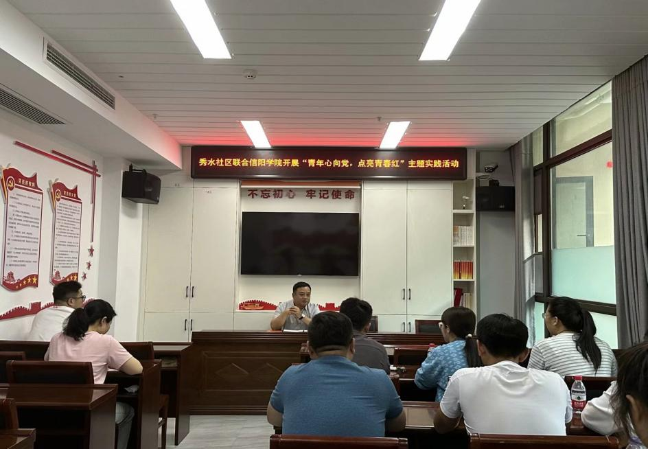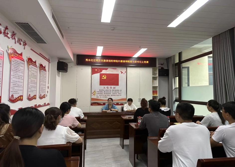 为进一步贯彻落实习近平新时代中国特色社会主义思想主题教育活动,5月19日下午,外国语学院党总支与信阳市浉河区秀水社区开展主题为“青春心向党,点亮青春红”的“支部联支部”实践活动。学院党支部书记代表赵晓伟、阎玉婷、沈蔷薇、黄伟及部分学生党员组成“青年宣讲团”,秀水社区党总支书记李林春、组织委员陈介丽及部分社区党员代表参与了此次活动。