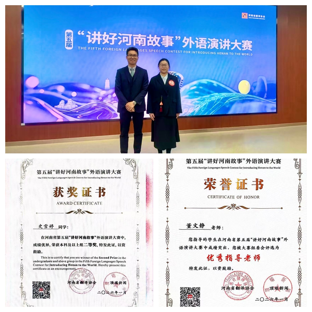 近日,河南省第五届“讲好河南故事”外语演讲大赛决赛成绩揭晓。我校外国语学院学子史雪婷在大赛中沉着冷静、发挥稳定,凭借扎实的演讲功底、科学的备赛策略和良好的心理素质,在众多参赛选手中脱颖而出,取得本科组二等奖。董文静老师被评为“优秀指导老师”。