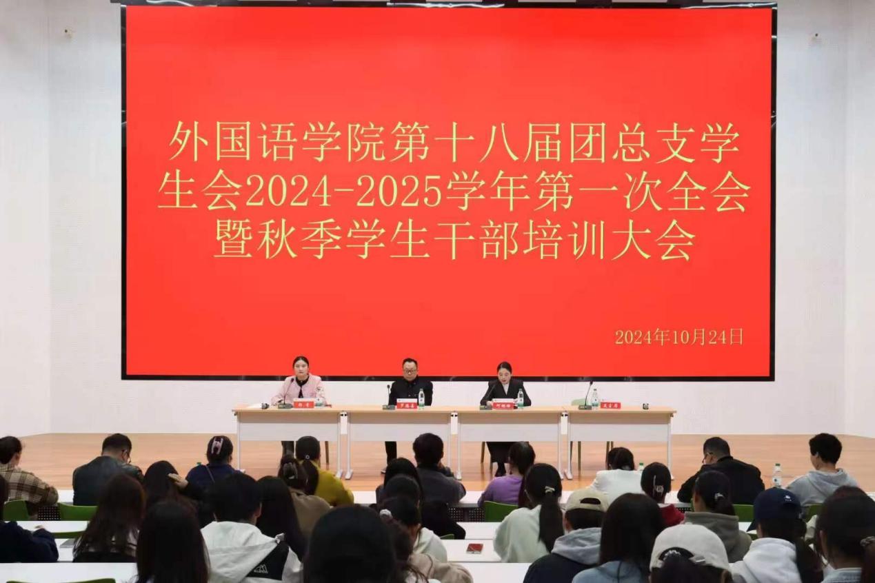 10月24日中午,外国语学院在教二楼117报告厅召开2024-2025学年第十八届团总支学生会暨秋季学生干部培训大会。外国语学院院长罗德喜、学工干事何珊珊、团总支书记郑青、全体辅导员及第十八届团总支学生会全体成员参加了此次会议。会议由郑青主持。
