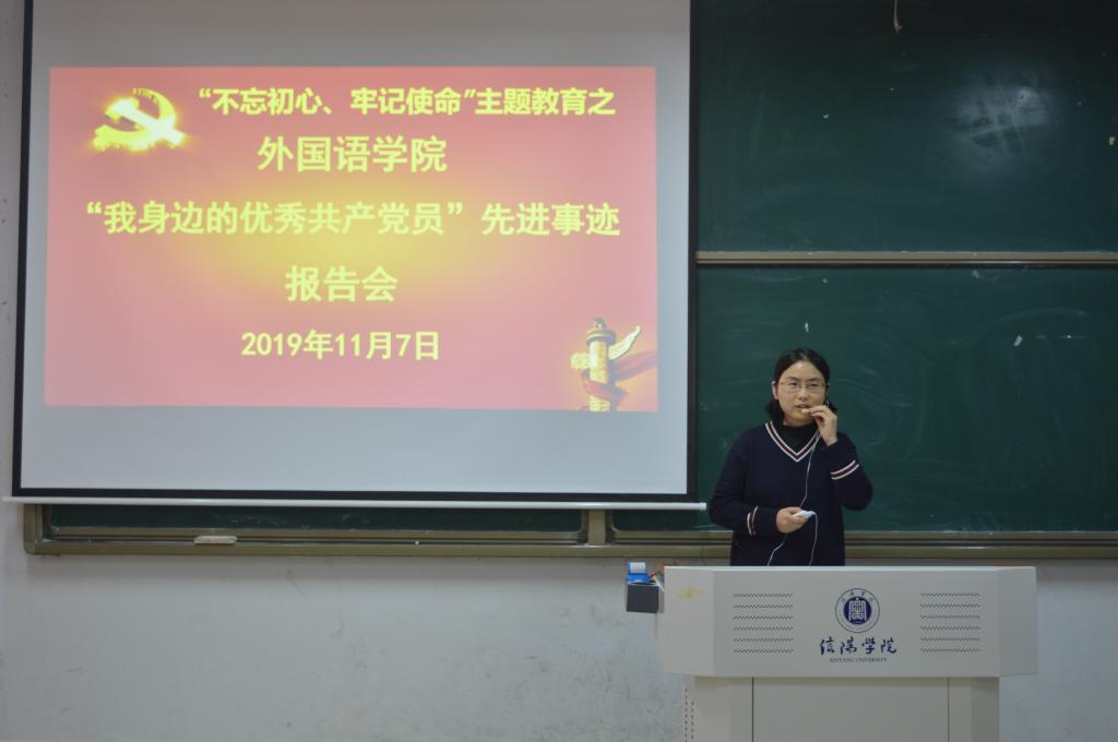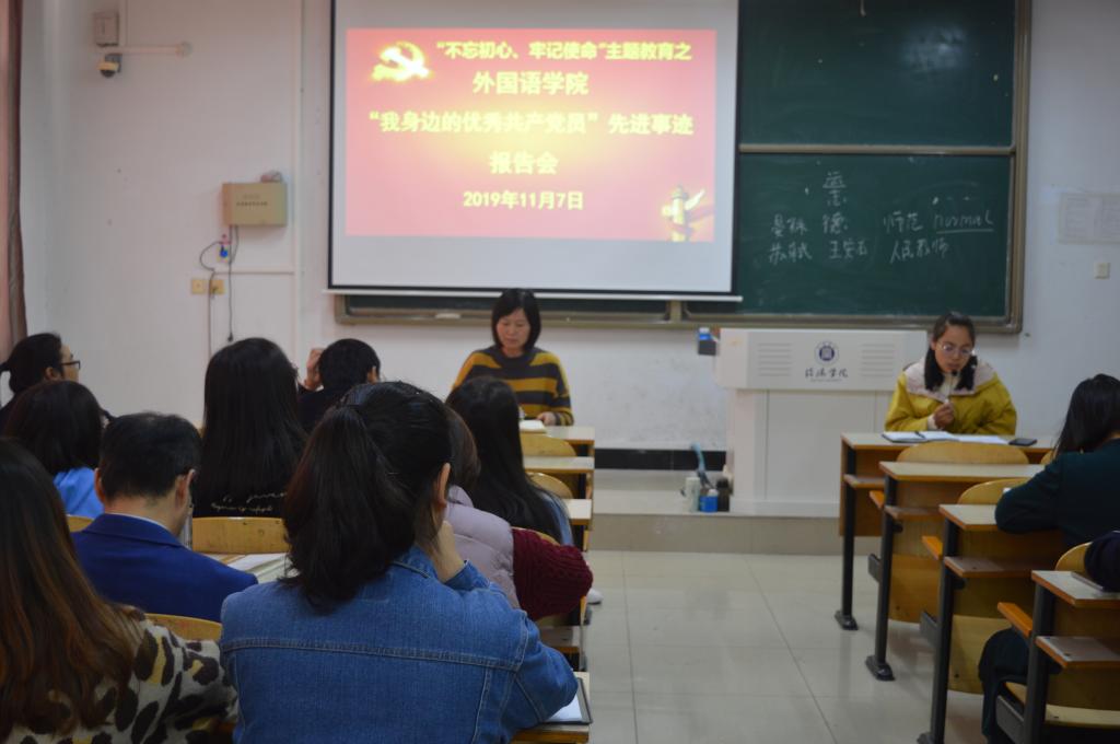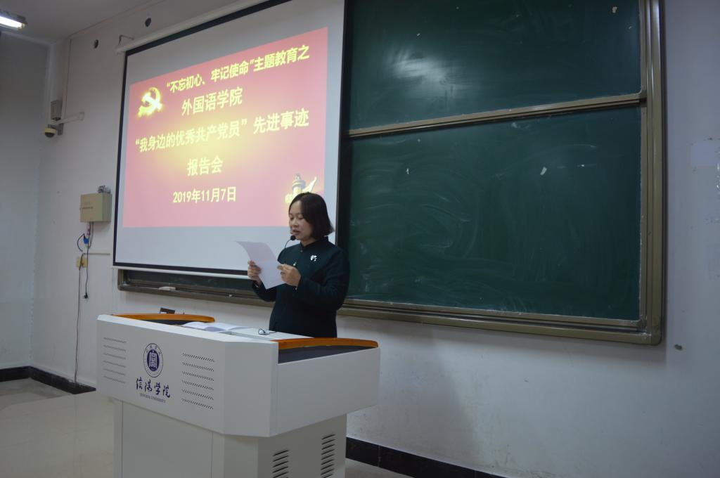 为推进“不忘初心、牢记使命”主题教育工作深入开展,11月7日下午,外国语学院在外语楼302教室召开“不忘初心、牢记使命”主题教育之“我身边的优秀共产党员”先进事迹报告会,院党总支书记李静和全院党员同志参加了会议。会议由院党总支宣传委员、学工负责人刘阳红主持。