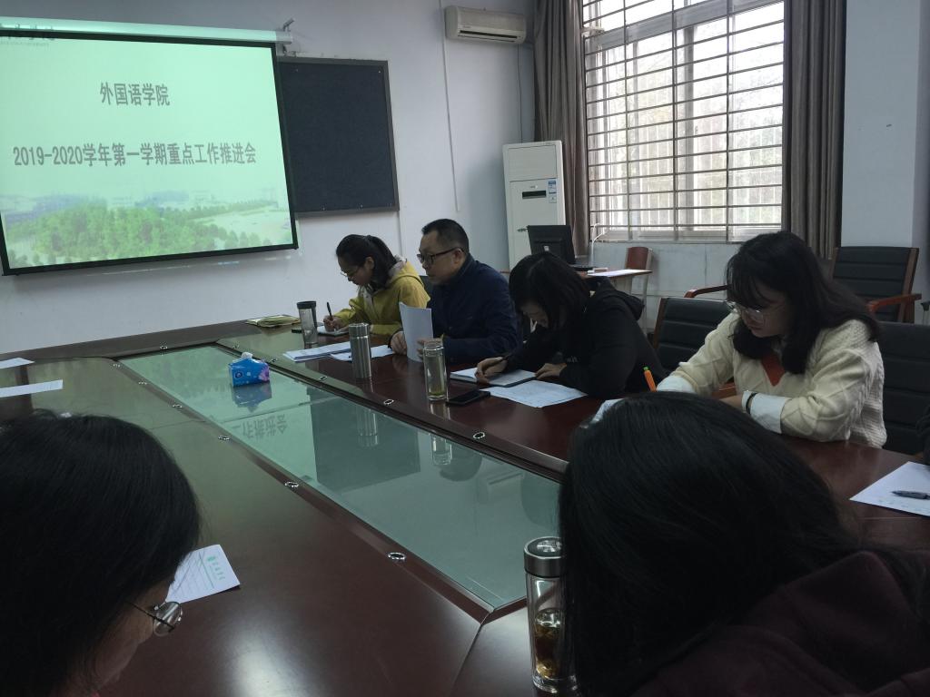为迎接教育部本科教学工作合格评估,贯彻全国、全省教育大会精神和王北生校长新学年讲话精神,11月8号上午,外国语学院在外语楼110会议室教室召开2019-2020学年第一学期重点工作推进会。院长罗德喜,院党总支书记李静,学工干事刘阳红,教学干事柳衡,行政干事梁书荣,教务员李达和教研室主任参加了工作推进会。会议由李静主持。