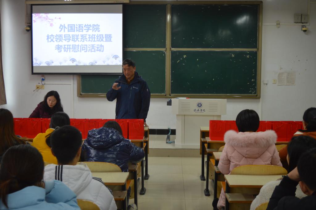 为增强考研学子的备考信心,鼓励学生为考研做好充分准备、积极面对即将到来的考试,12月3日下午,外国语学院在外语楼304教室开展校领导联系班级暨考研慰问活动。学校战略发展咨询委员会主任熊健民、外国语学院党总支副书记程娇炎、学工干事刘阳红、毕业班辅导员和2017级考研学子参加了本次慰问活动。程娇炎主持活动。