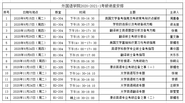 2020年10月15日和11月17日,郭耀忠老师作《漫谈英语专业考研应备之事(一)》和《漫谈英语专业考研应备之事(二)》讲座