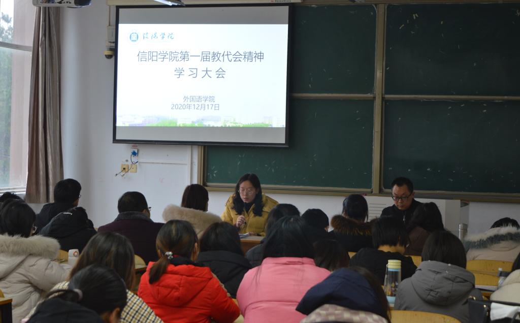 12月17日下午,外国语学院在外语楼304教室召开全体教师会议,传达、学习学校第一届教代会精神。院长罗德喜、党总支书记程娇炎、教学副院长李静及全体教师参加了会议。会议由程娇炎主持。