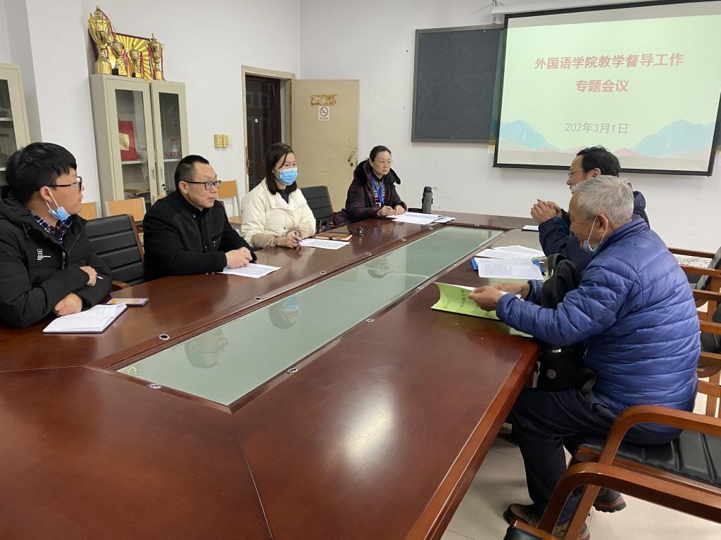 学院督导专家组组长康传彪传达了学校教学质量监控中心2020-2021学年第二学期教学督导工作会议精神,结合我院实际,就本学期外国语学院相关工作作出了安排。与会成员交流了本学期督导工作情况,对下阶段教学督导工作进一步细化,并决定分组对本学院全体教师授课情况进行检查和督导,以保证良好的教学秩序,提高教学质量。