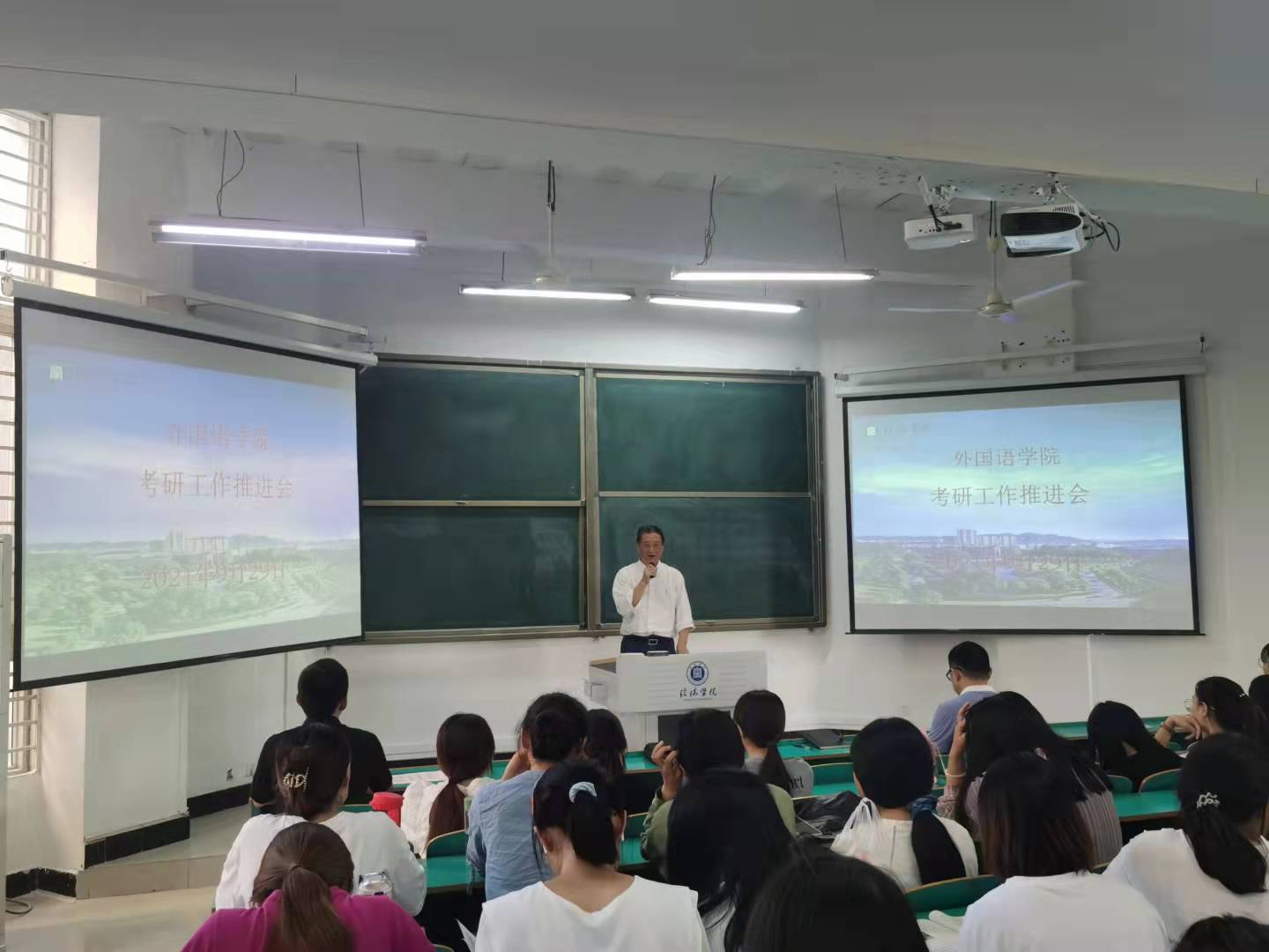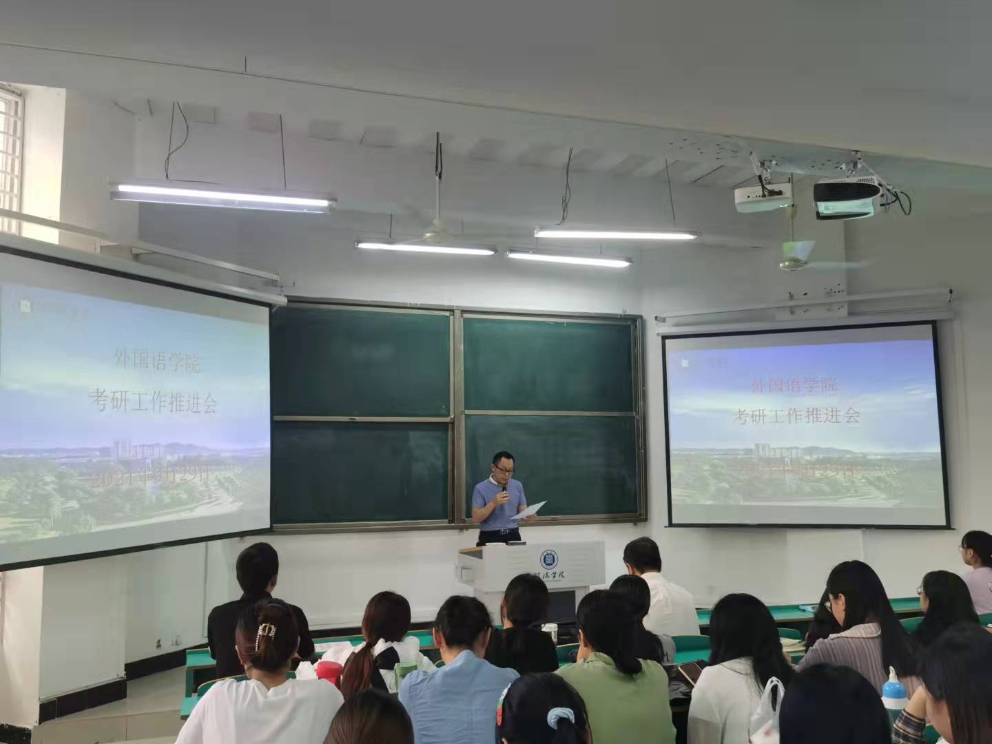 为提高2018级毕业生考研动力,坚定考研信心,营造良好的备考环境,9月29日下午,外国语学院在数计楼105教室召开考研工作推进会。此次会议邀请了信阳学院战略发展咨询委员会主任熊健民、外国语学院院长罗德喜、校长办公室干事孟祥龙、外国语学院党总支副书记程娇炎、学工干事何珊珊、综合英语教研室教师刘阳红出席,2018级辅导员和全体考研学生参加会议。会议由何珊珊主持。