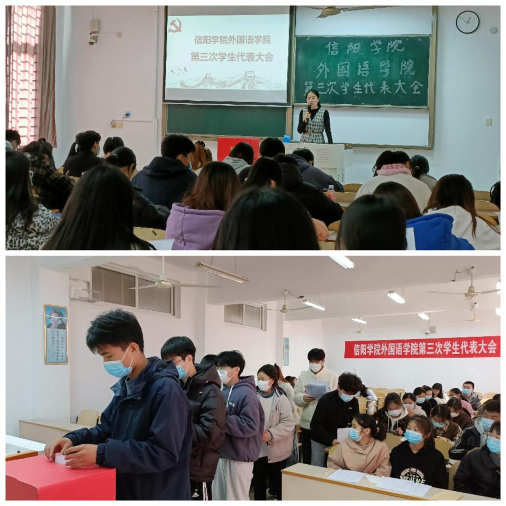 以习近平新时代中国特色社会主义思想为指导,为深入学习习近平总书记在庆祝中国共产党成立100周年大会上的讲话精神,全面贯彻党的十九届六中全会精神、河南省第十一次党代会精神和团的十八大等重要讲话和精神,落实《关于推动高校学生会(研究生会)深化改革的若干意见》《信阳学院学生会改革方案》,引领广大青年凝聚思想意志,努力开创团学事业新局面,外国语学院于11月24日中午召开第三次学生代表大会,参会人员有外国语学院学工干事何珊珊、团总支书记吴章丽、学生代表和优秀团员代表。
