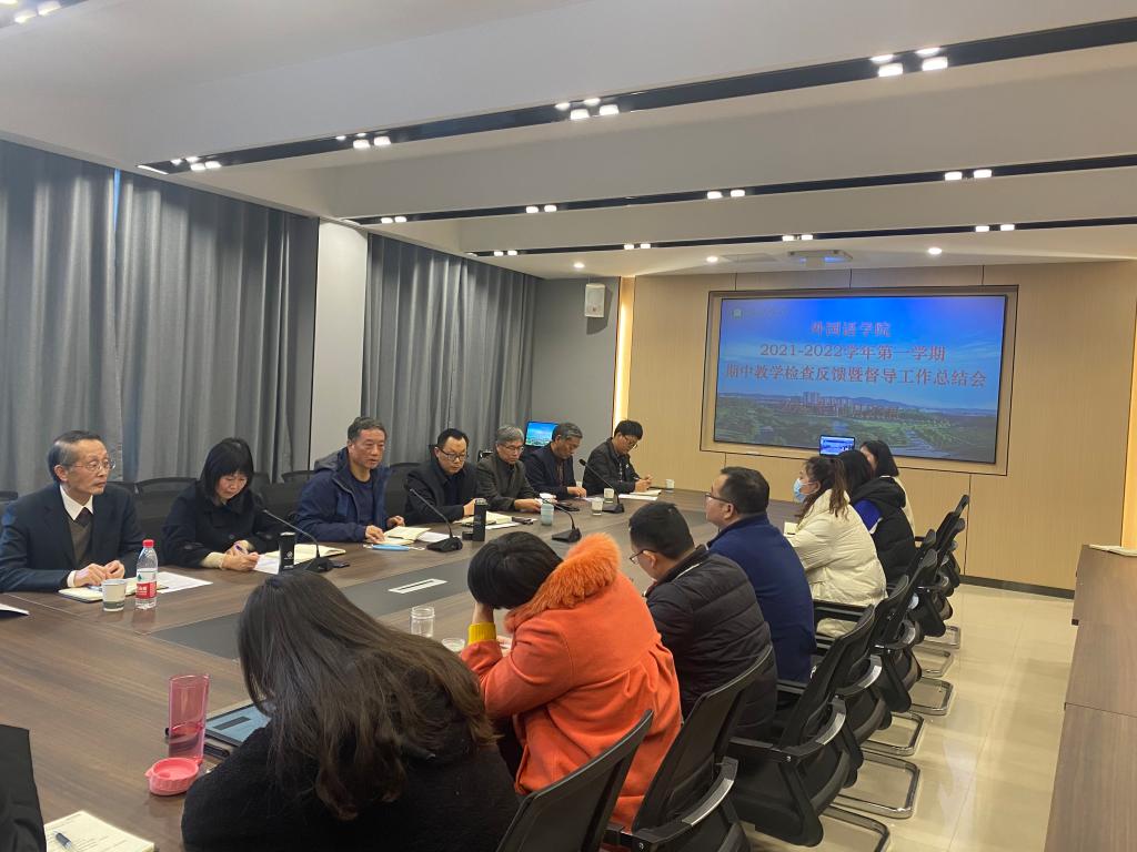 为有力推进本科教学合格评估工作进一步细化、落实,11月23日下午,外国语学院在外语楼110会议室召开了了2021-2022学年第一学期期中教学检查暨督导工作总结会。校战略发展咨询委员主任会熊健民、校督导专家刘汇教授、张驰教授、马建合教授和何杰英教授受邀莅临外国语学院指导工作。外国语学院院长罗德喜、党总支副书记程娇炎、教学副院长李静、学院干事、教务员和教研室主任参加了主会场会议,其他教师在各自教研室参加线上会议。会议由李静副院长主持。