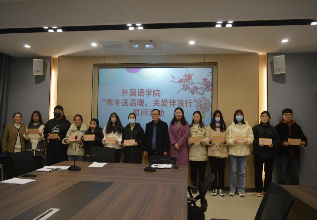 近日,外国语学院在外语楼110举行“寒冬送温暖,关爱伴我行”慰问活动。外国语学院院长罗德喜,党总支副书记程娇炎、学工干事何珊珊、辅导员老师及受助的学生参加了此次活动。会议由何珊珊主持。