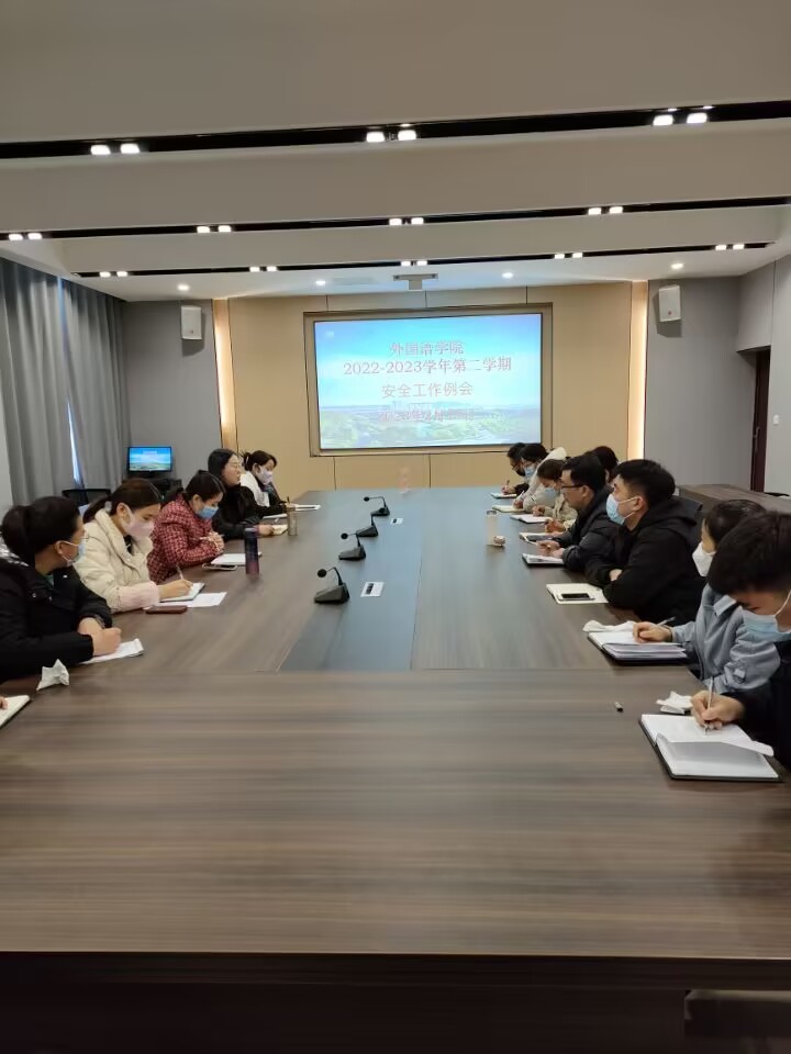 为进一步提升学生安全意识,与时俱进开展新学期安全教育工作,近日,外国语学院在外语楼110会议室召开本学期学生安全工作专题会议。党总支副书记程娇炎、学生工负责人何珊珊以及全体辅导员参加了此次会议。