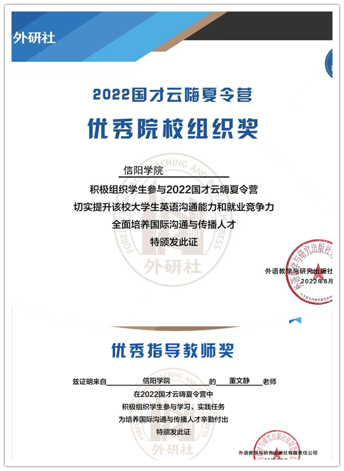 近日,由外研社主办、国才考试特别举办2022国才冬令营圆满收官。信阳学院外国语学院师生喜获佳绩,荣获冬令营优秀营员5名,优秀实习生1名,优秀指导教师1名。同时,学校荣获全国“优秀院校组织奖”。