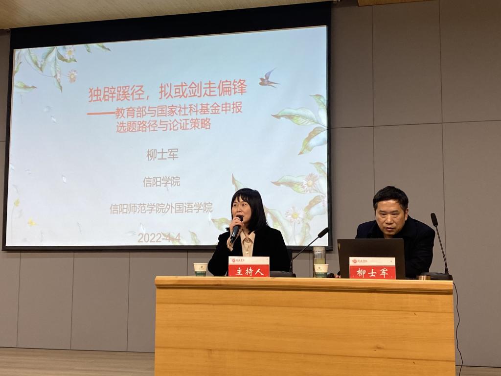 4月4日下午,应我校外国语学院邀请,信阳师范学院柳士军博士在图书馆101报告厅作了题为“独辟蹊径与剑走偏锋——教育部与国家社科基金的选题论证与申报撰写”的学术报告。外国语学院党总支书记程娇炎、教学副院长李静和学院全体教师共同聆听了报告。李静主持了报告会。