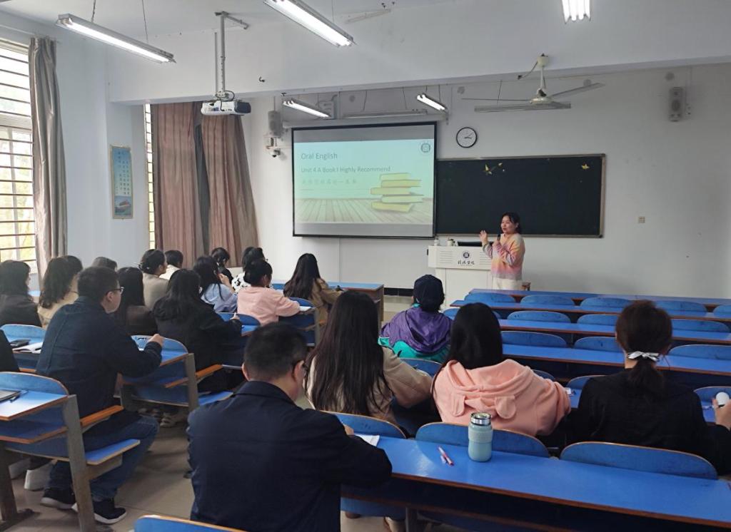 首先井自纯老师为新入职教师展现了一节生动的口语示范课。内容主要包括课程单元设计及教学比赛经验分享两部分。井自纯老师采用BOPPPS模型,从课前、课中和课后三个阶段设计了一节精彩的口语课。课堂“无生”,精彩有声,井老师的无生互动环节运用得恰到好处。最后,井自纯老师向新入职教师分享自己参加校第十五届课堂教学创新大赛中的心路历程。从赛前准备、赛中工作及赛后总结等方面详尽地介绍参加比赛需要注意的要点,鼓励青年教师勇于迈出第一步,不断优化更新自己的理念和想法。