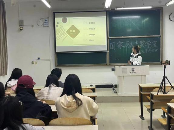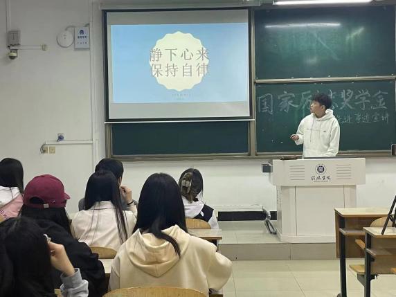 为激励我院学子勤奋学习、努力进取,在德、智、体、美等方面全面发展,外国语学院于4月18日在外语楼202教室开展国家励志奖学金系列宣讲活动。演讲首先由22级英语本科3班武凯东同学进行经验分享。武凯东同学首先分享了个人的学习经历,接着简单介绍综测成绩是国家励志奖学金的关键申报条件,随后分别从听、说、读、写方面分享了自身的学习方法,并与同学们积极互动,讨论并解决学习上的问题。