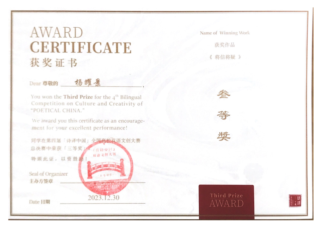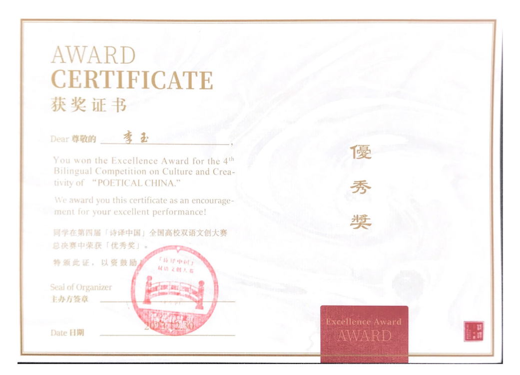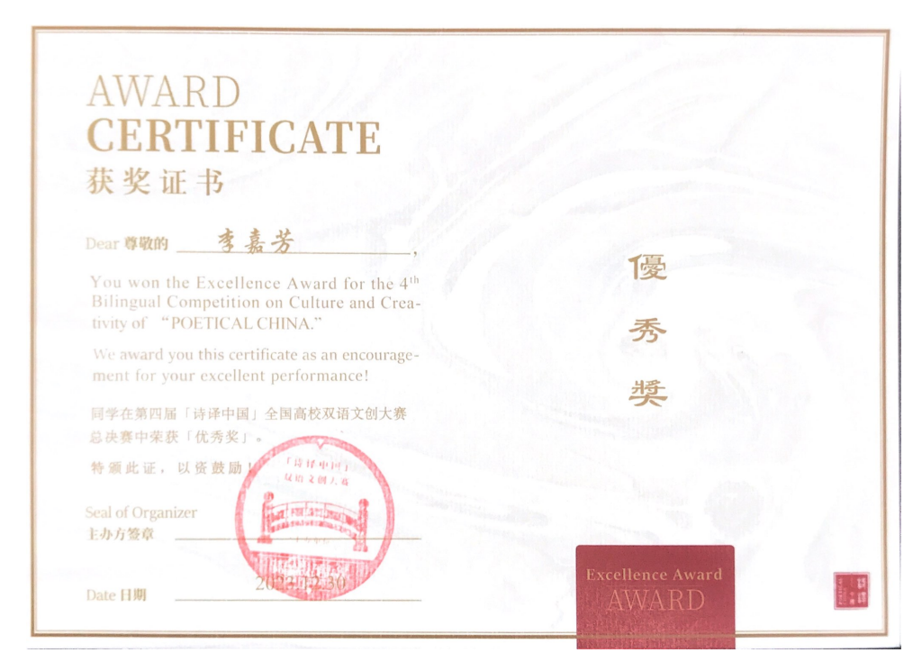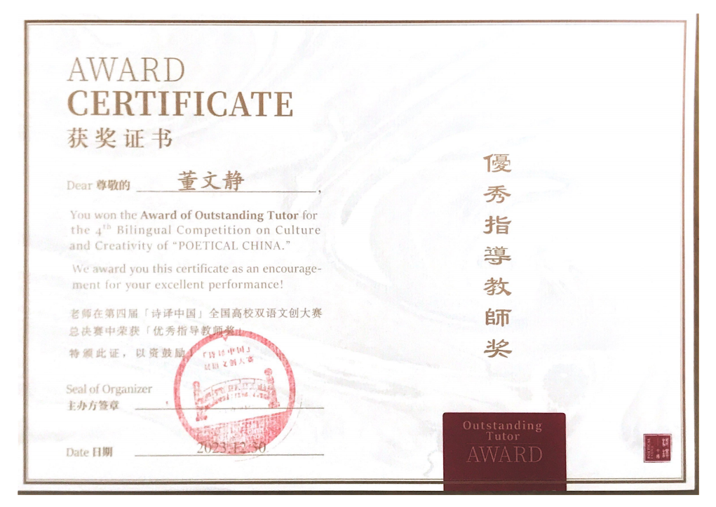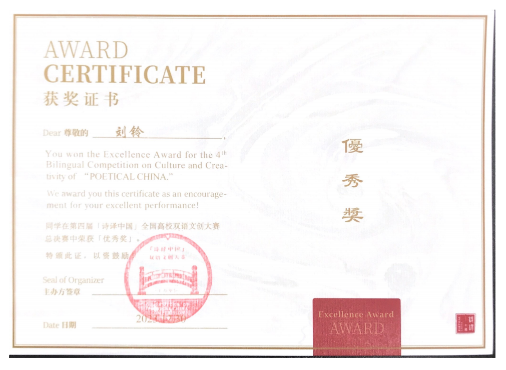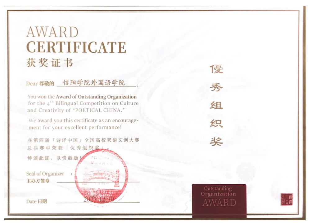 近日,由北京外国语大学英语学院、大连外国语大学英语学院、广西民族大学外国语学院、中国外文局文化传播中心、韬奋基金会和曼普洛教育等联合举办的第四届「诗译中国」全国高校双语文创大赛公布了比赛结果。经过初赛、复赛和总决赛的激烈角逐,杨耀景和何聪聪同学获得全国三等奖;武凯东同学获得中华文化传播视频人气奖第一名;李茜雅、曹鑫予、崔雨婷、杜佳忆等12位同学获得优秀奖。信阳学院外国语学院在总决赛中荣获全国高校“优秀组织奖”。外国语学院董文静、夏洁两位老师荣获全国高校“优秀指导教师”。